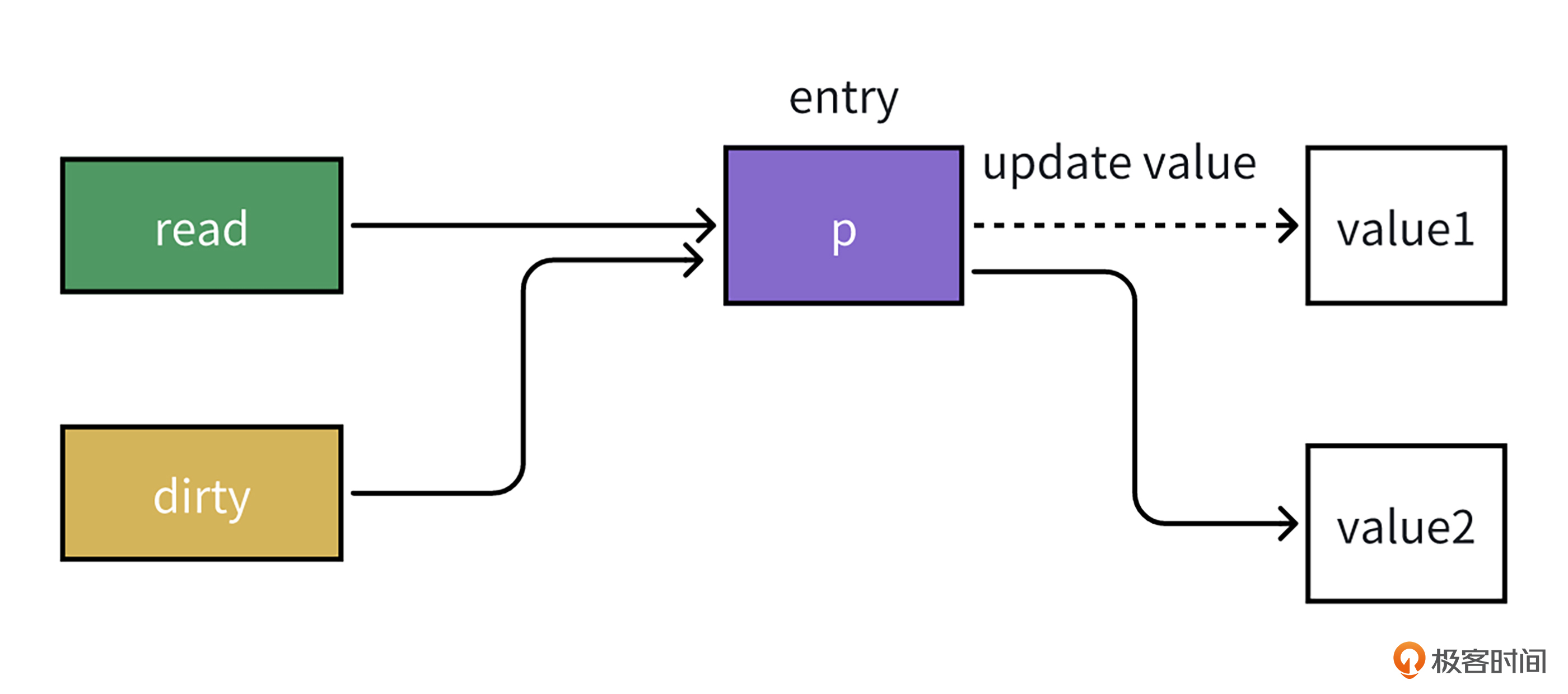 因此在更新时就像下面的图那样,可以直接用CAS无锁操作替换指针p指向的变量,而无需做加锁操作。