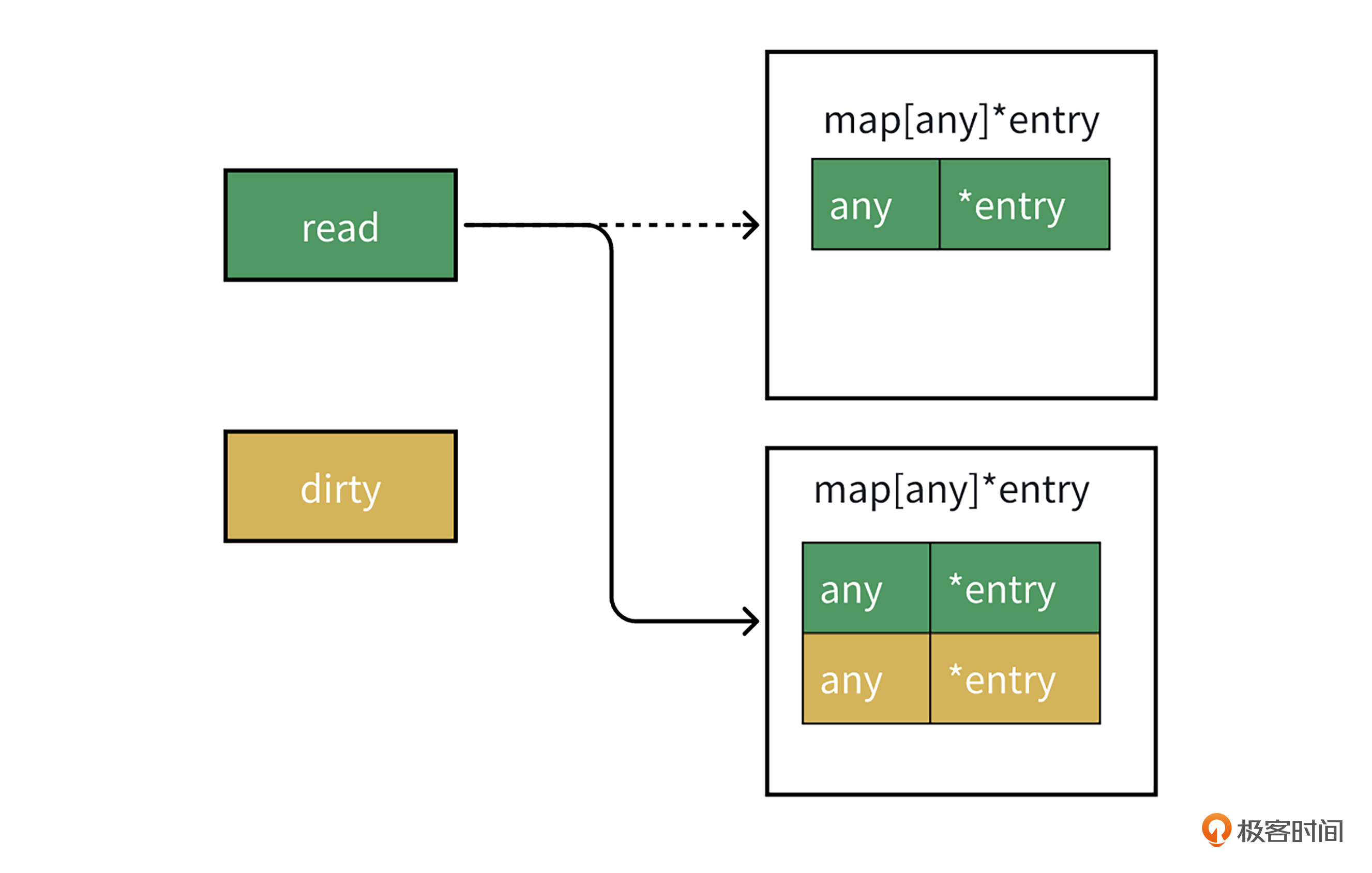 首先,我们来看下sync.Map的底层数据结构,它的核心是read和dirty两个map结构。read存储了部分写入Map的内容,用来加速读操作。而dirty存储了全量内容,需要加锁才能读写数据。