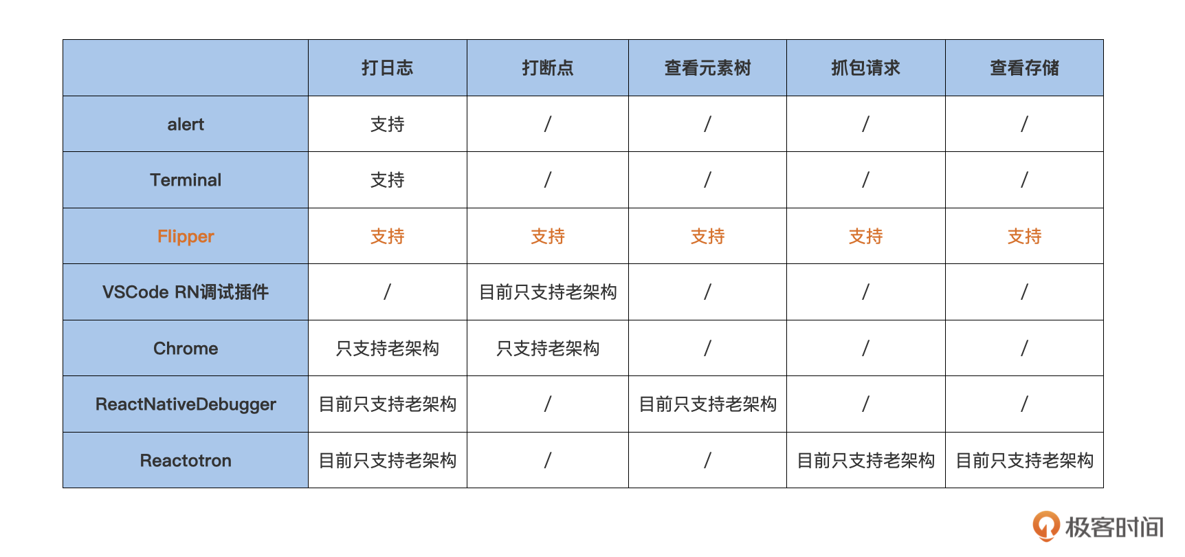 在分析阶段,必不可少的就是(狭义)调试工具,像打日志、打断点、抓包请求、查看存储这些功能都需要调试工具的支持。我给你画了一张调试工具功能图,涵盖了各类调试工具的支持程度: