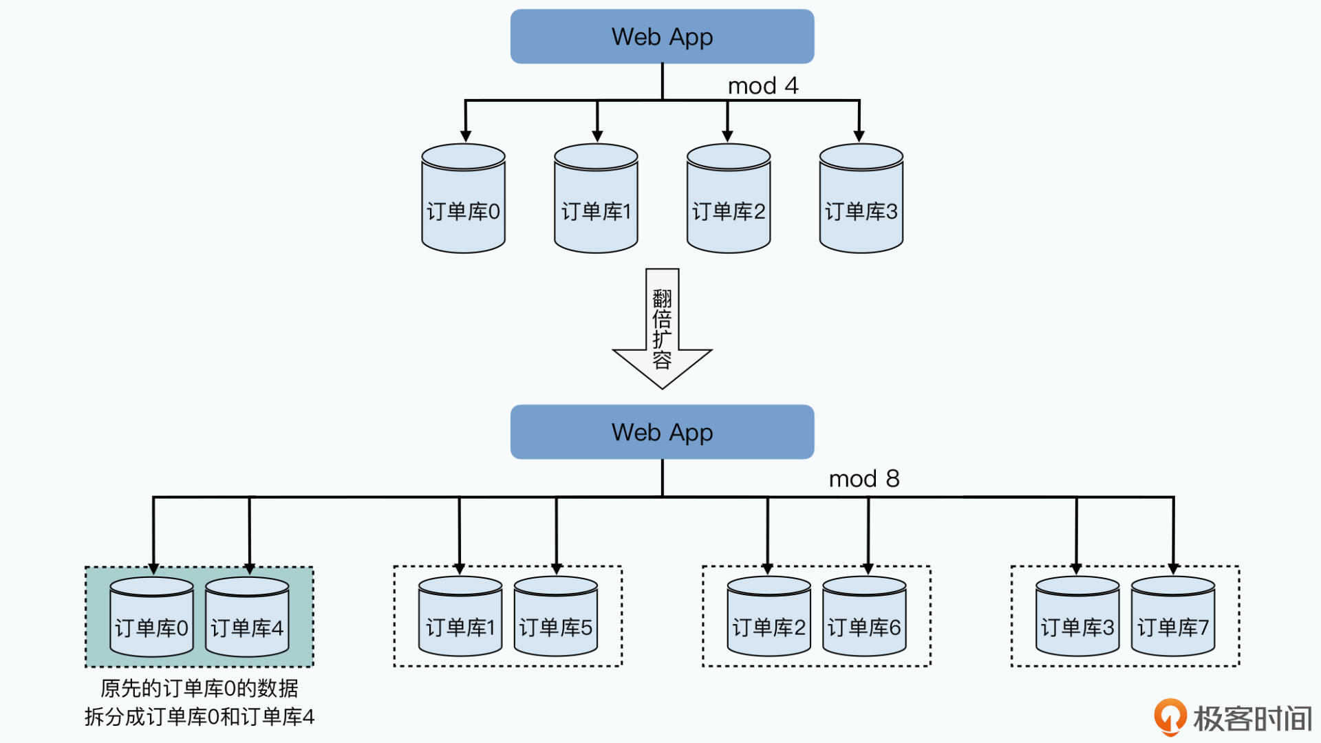首先,是资源使用很浪费。当服务器性能出现瓶颈需要扩容的时候,我们常常只能采取“翻倍”分库增加服务器的方案。就以前面举的订单表为例,我们通过把订单号“模”上个4,拆分到4个不同的服务器的数据库里。