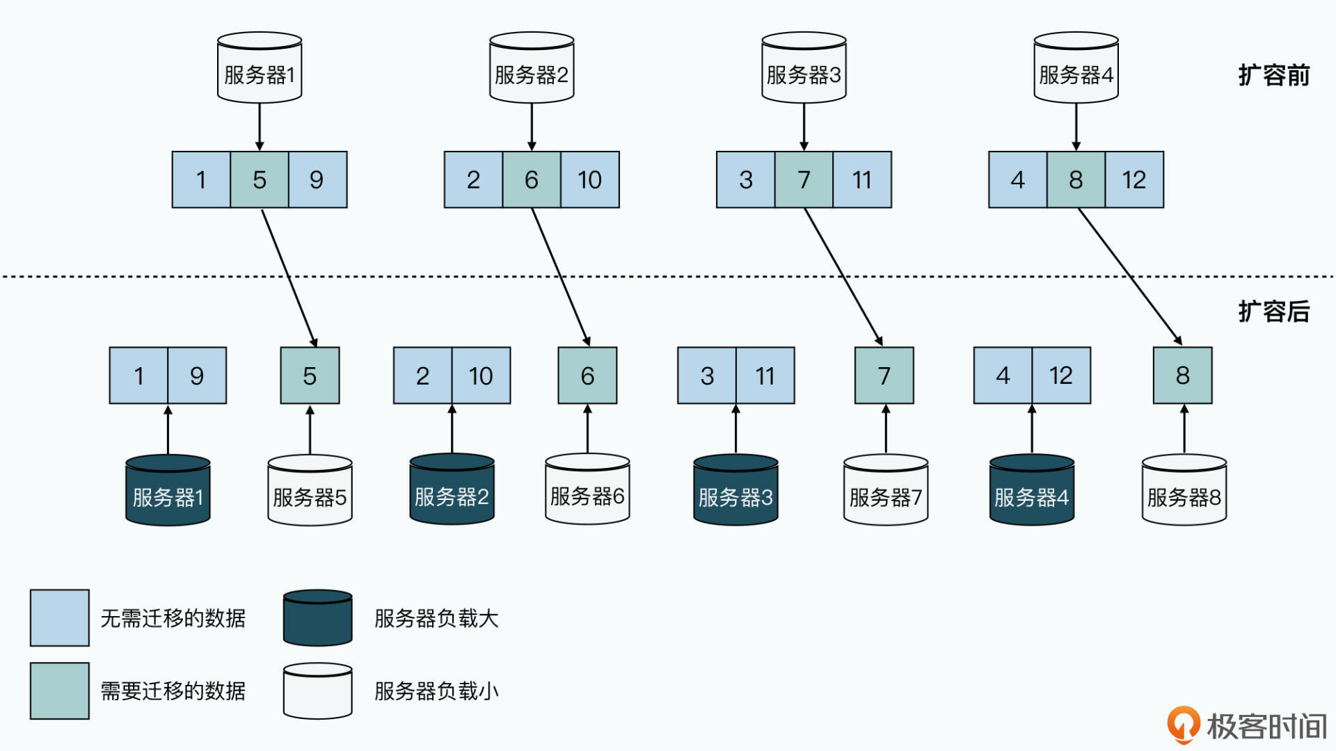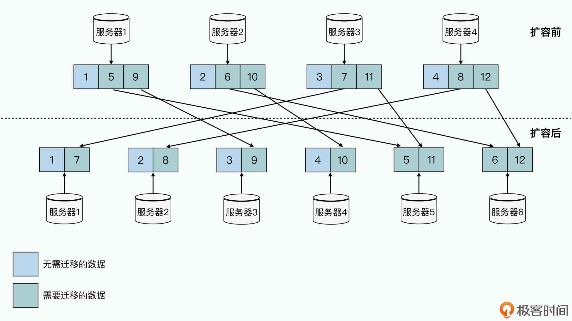 为什么呢?因为如果我们只增加2台服务器,把各个服务器的分片,从模上4变成模上6,我们就需要在增加服务器之后,搬运大量的数据。并且这个数据搬运,不只是搬到新增加的服务器上,而是有些数据还要在原有的4台服务器上互相搬运。