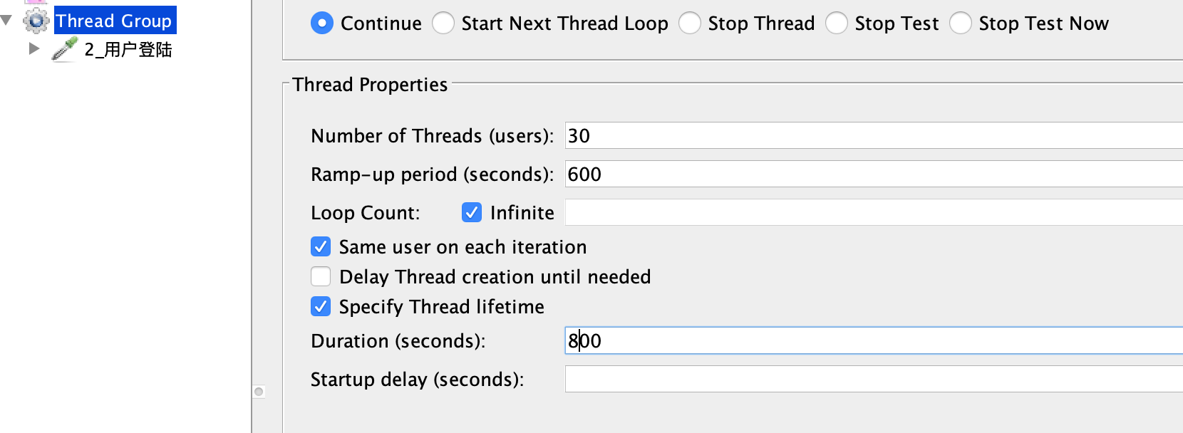 在图中,我上到了30个线程,这里也可以不要高出那么多,只要高出25个线程就可以了。我把Ramp-up period设置为600秒,也就是20秒上一个线程,这样就会产生一个明显的连续递增的过程。