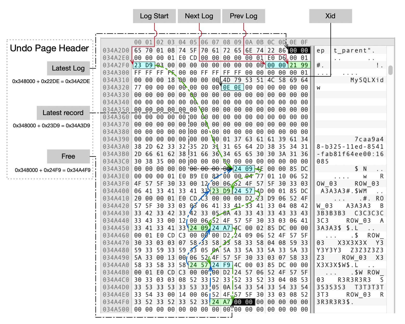 - Latest Log(22DE)指向页面内最新的Undo日志头,地址为0x348000 + 0x22DE = 0x34A2DE。