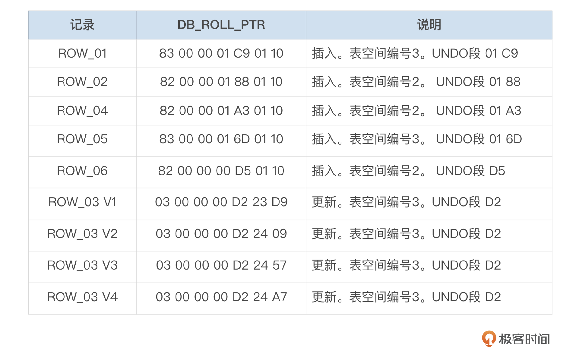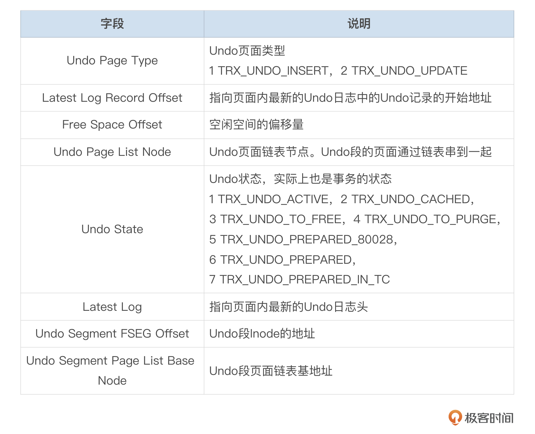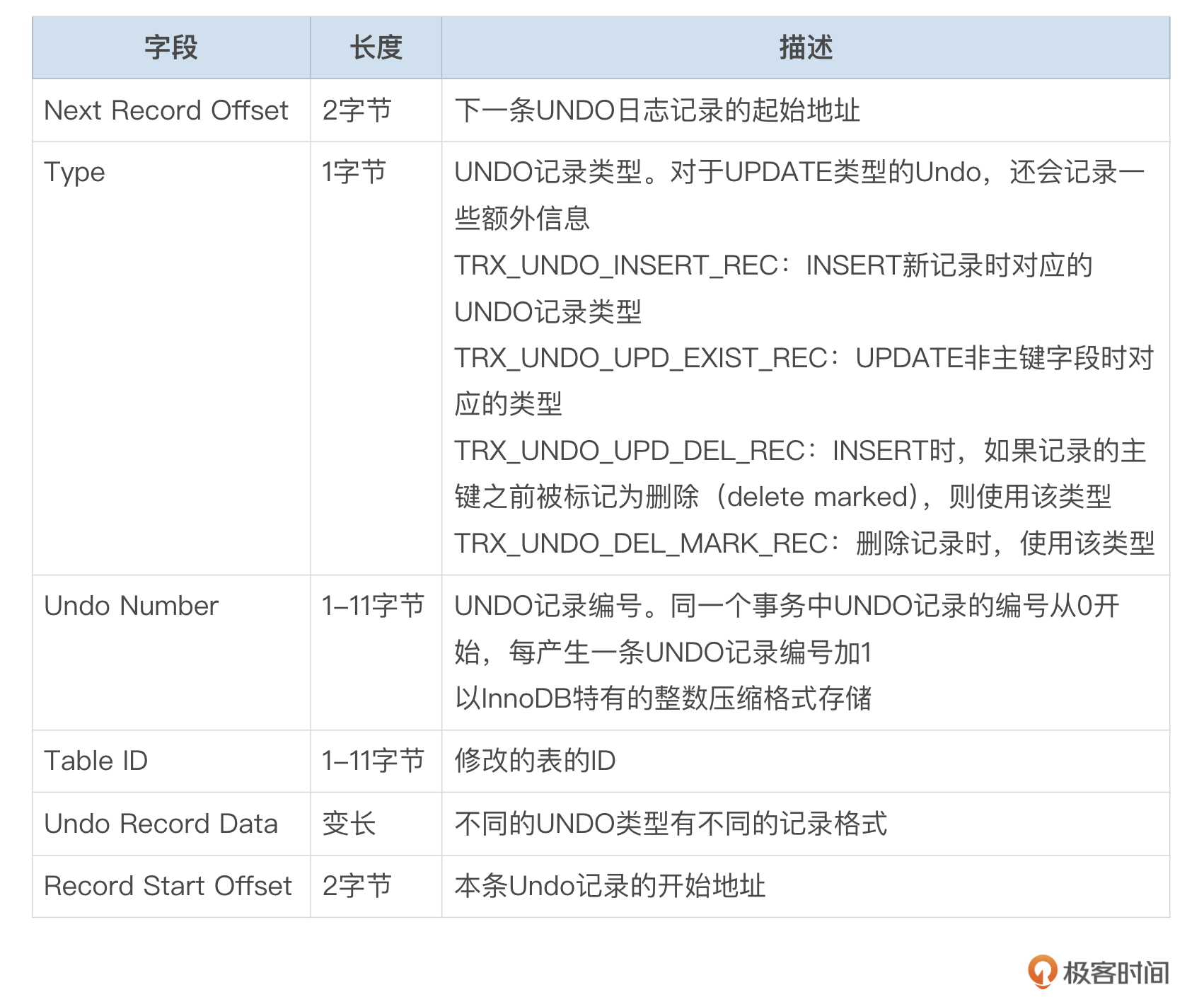 Undo记录中字段的描述信息参考下面这个表格。