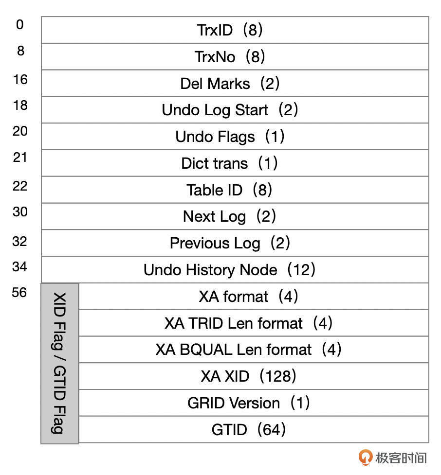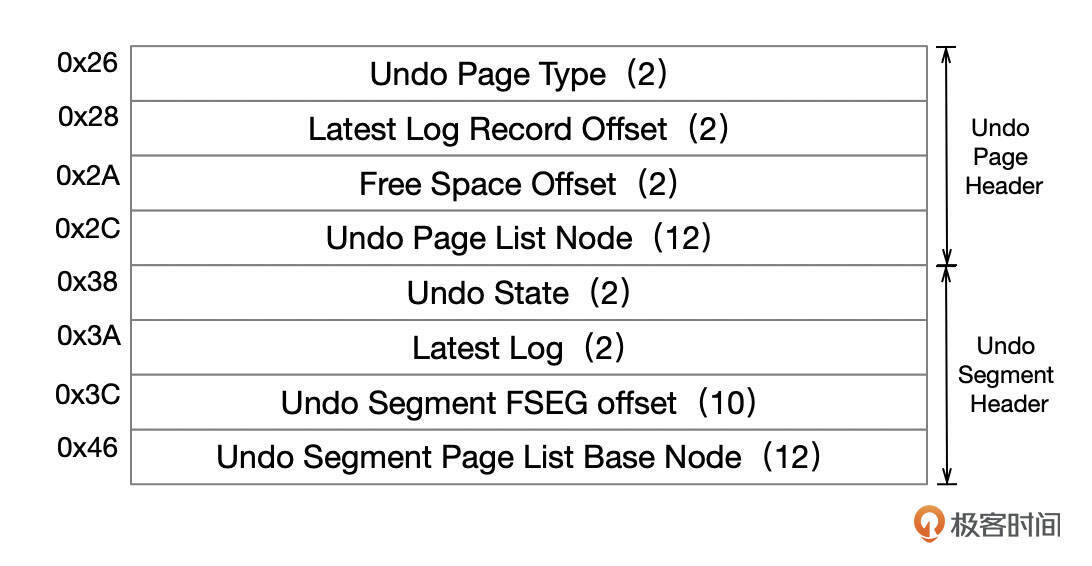 Undo日志最终会存放在Undo段中。Undo段由Undo页头、Undo段头、Undo日志组成。Undo页面头、Undo段头的格式参考下面这张图。Undo段头存放在段内第一个Undo页的页头之后。