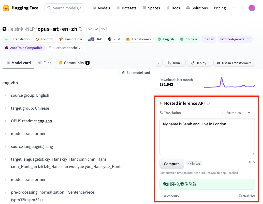 我们点击Helsinki-NLP/opus-mt-en-zh进入这个模型的卡片页,就能看到更详细的介绍。并且很多模型,都在右侧提供了对应的示例。不使用代码,你也可以直接体验一下模型的能力和效果。
