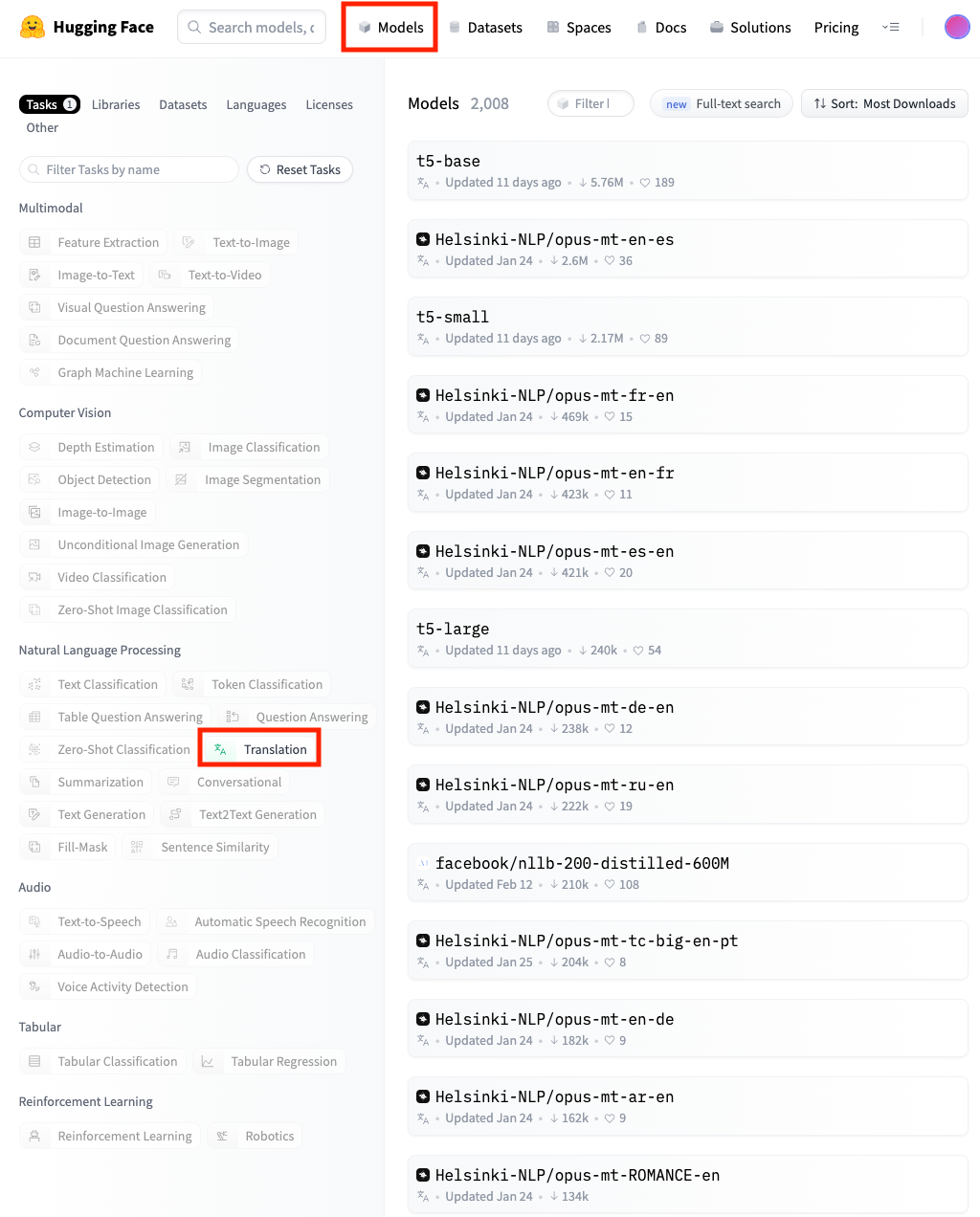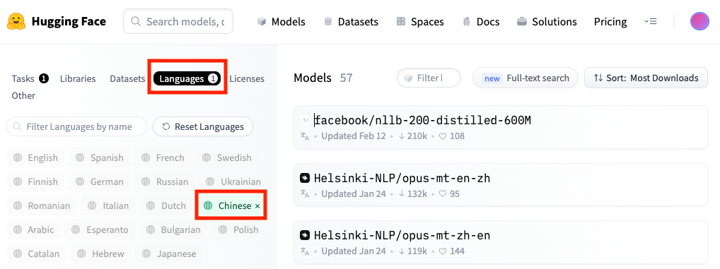 这个时候,我们就需要去HuggingFace的网站里找一找了。你点击网站的 Models 板块,就可以看到一个界面,左侧是一系列的筛选器,而右侧则是筛选出来的模型。比如刚才的英译中的模型,我们就是先在左侧的筛选器里,选中Task下的Translation这种任务类型。然后再在Languages里面选择Chinese,就能找到所有能够翻译中文的模型。默认的模型排序是按照用户下载数量从高到低排序的。一般来说,下载的数量越多,往往也意味着大家觉得这个模型可能更加靠谱。