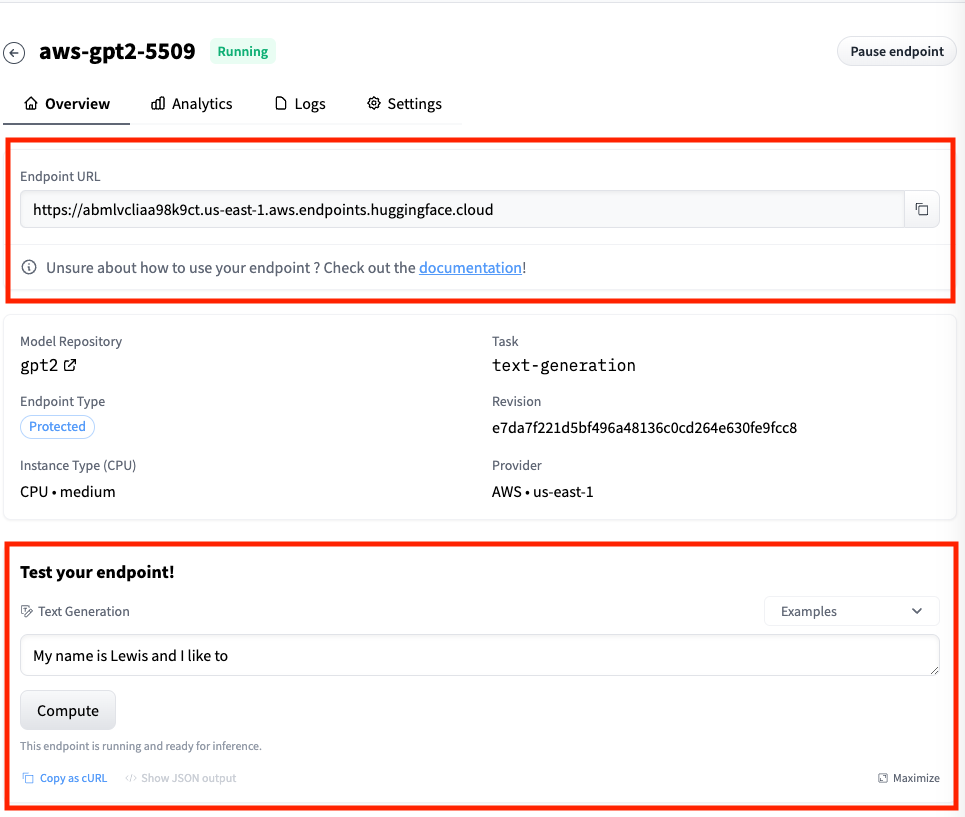我们只要等待几分钟,模型就能部署起来。当然,这是因为GPT2的模型比较小。如果你尝试部署一些大尺寸的模型,可能需要1-2个小时才能完成。因为HuggingFace要完成模型下载、Docker镜像打包等一系列的工作,单个模型又很大,所以需要更长时间。
