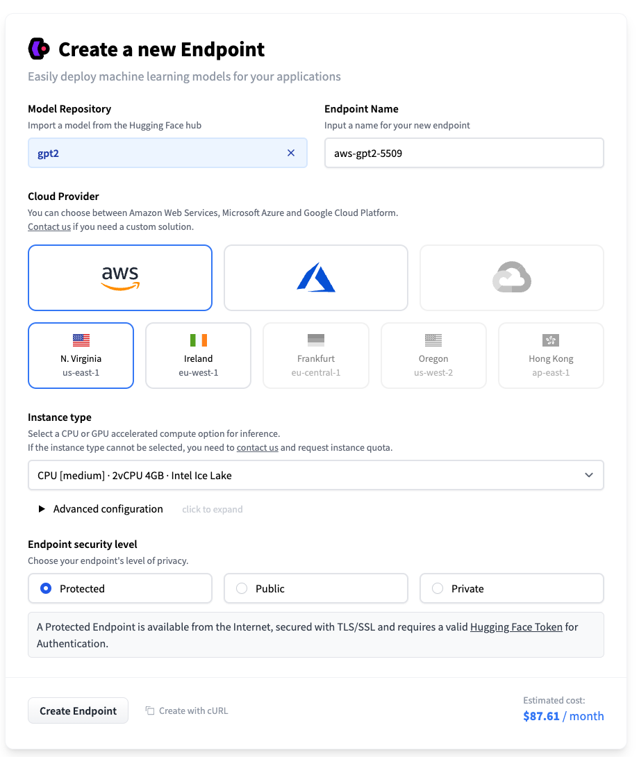 HuggingFace自己就提供了一个非常简便的部署开源模型的产品,叫做Inference Endpoint。你不需要自己去云平台申请服务器,搭建各种环境。只需要选择想要部署的模型、使用的服务器资源,一键就能把自己需要的模型部署到云平台上。