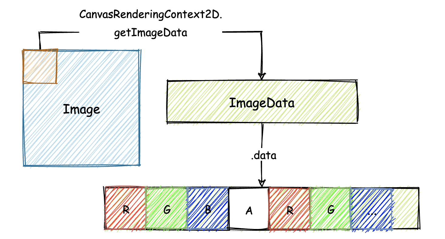 getImageData 在执行完毕后会返回一个 ImageData 类型的对象,在该对象中有一个名为 data 的属性。data 属性实际上是一个 Uint8ClampedArray 类型的 “Typed Array”,其中便存放着所有像素点按顺序排放的 RGBA 分量值。你可以借助下面这张图来帮助理解上面我们描述的,各个方法与返回值之间的对应关系。