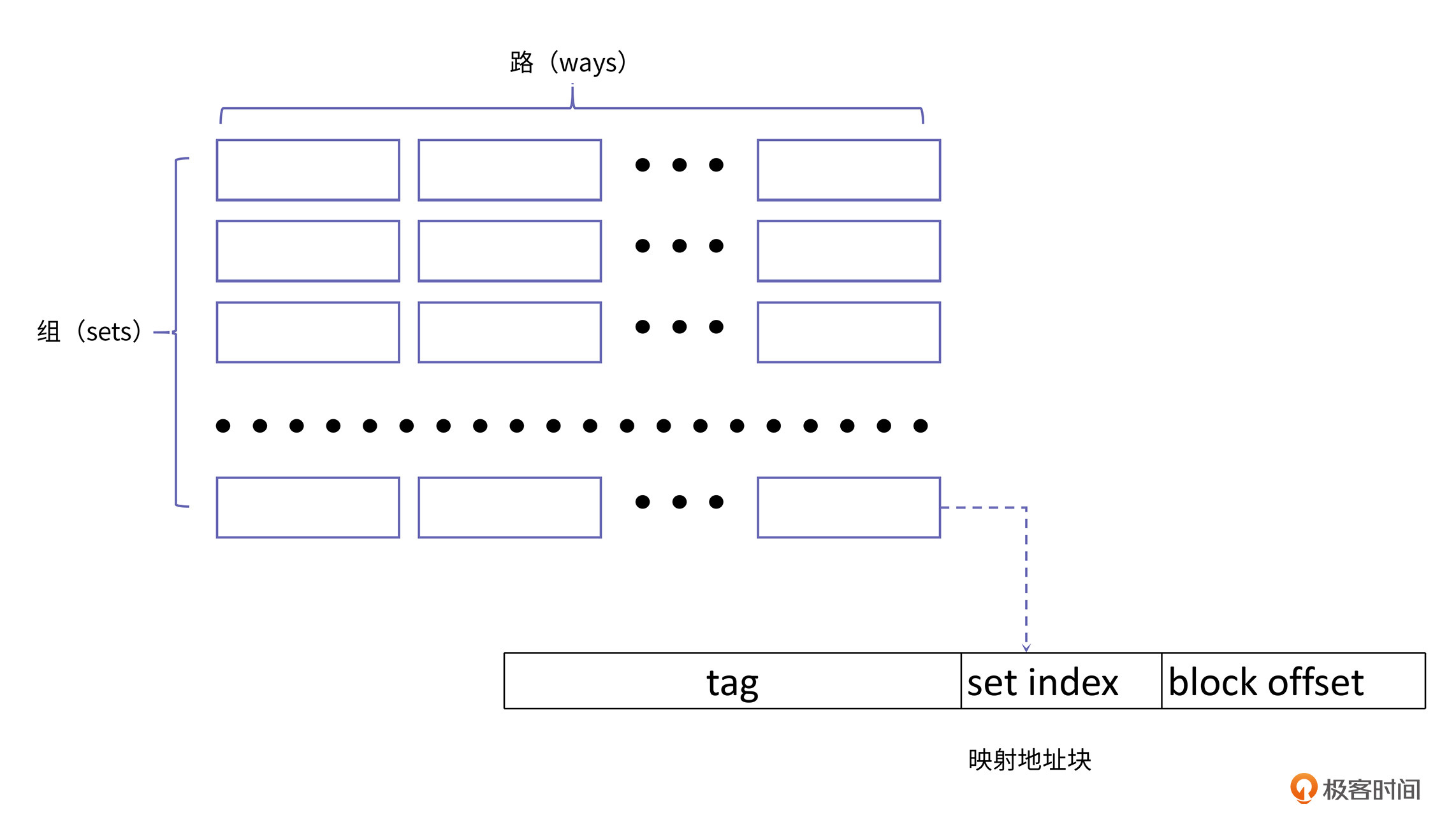 上图中的小方框就代表一个缓存块。从图中,你也可以看到,整个缓存由组(set)构成,每个组由路(way)构成。所以整个缓存容量等于组数、路数和缓存块大小的乘积: