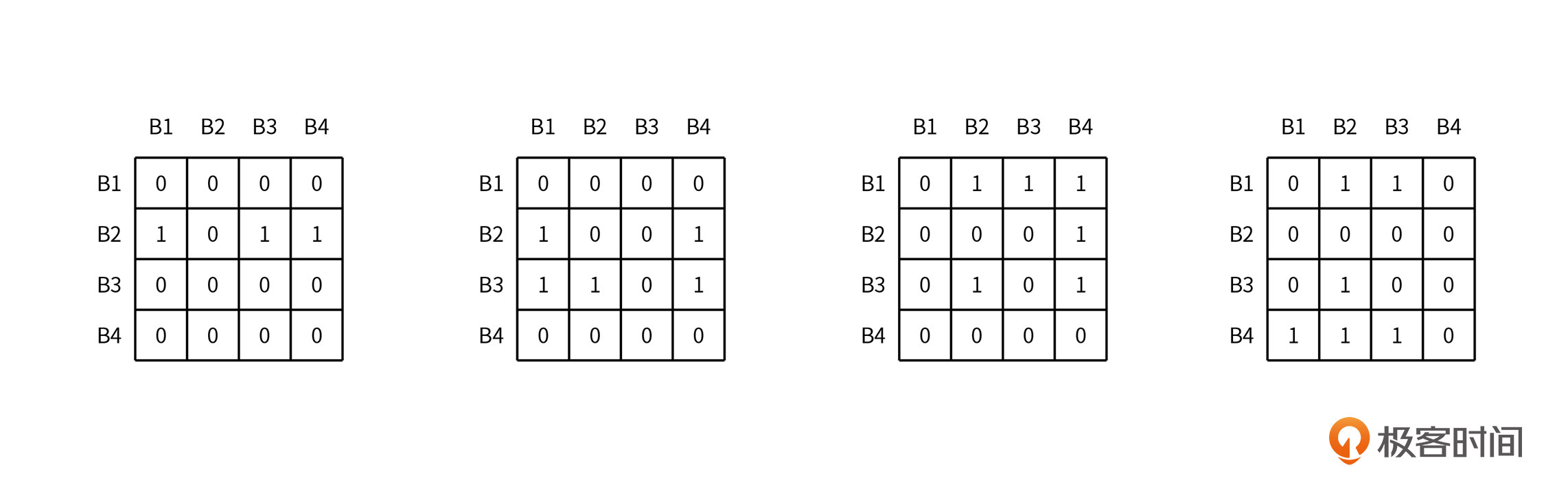 假设现在一个四路相连的缓存组包含数据块 B1、B2、B3、B4, 数据块的访问顺序为 B2、B3、B1、B4,那么LRU矩阵在每次访问后的变化如下图所示: