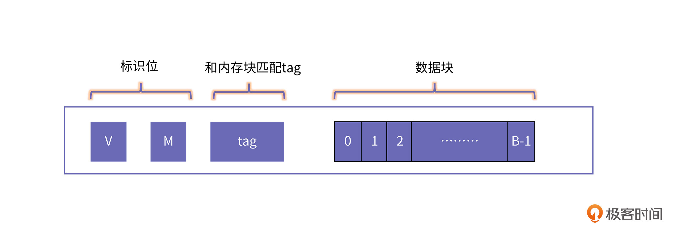 其中,V(valid)表示这个缓存块是否有效,或者说是否正在被使用;M(modified)表示这个缓存块是否被写,也就是“脏”位;B表示缓存块的bit个数。
