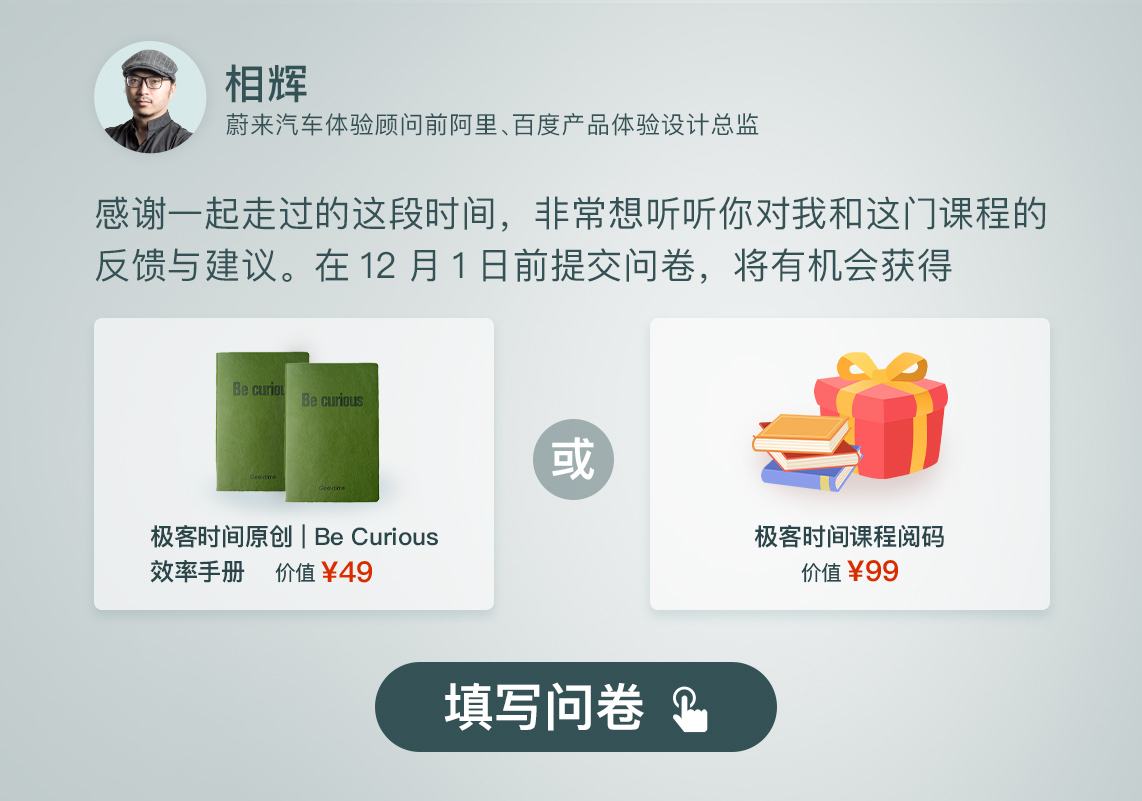 最后,我还给你准备了一份毕业问卷,题目不多,希望你能在问卷里聊一聊你对这门课的看法。欢迎你点击下面的图片,用1~2分钟时间填写一下,期待你畅所欲言。当然了,如果你对课程内容还有什么问题,也欢迎你在留言区继续提问,我会持续回复你的留言。