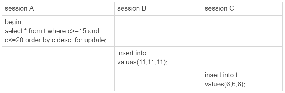如果你之前没有了解过本篇文章的相关内容,一定觉得这三个语句简直是风马牛不相及。但实际上,这里session B和session C的insert 语句都会进入锁等待状态。