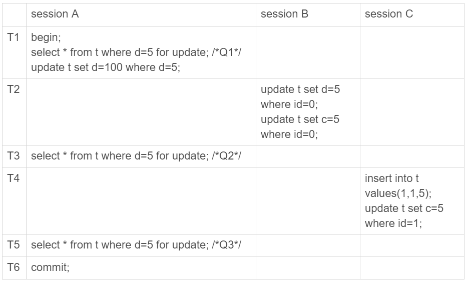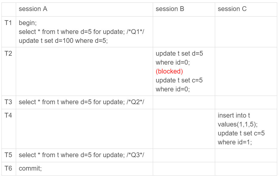 为了说明这个问题,我给session A在T1时刻再加一个更新语句,即:update t set d=100 where d=5。
