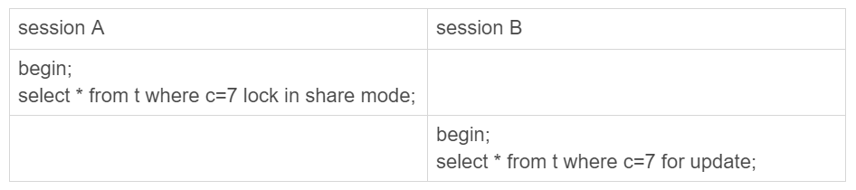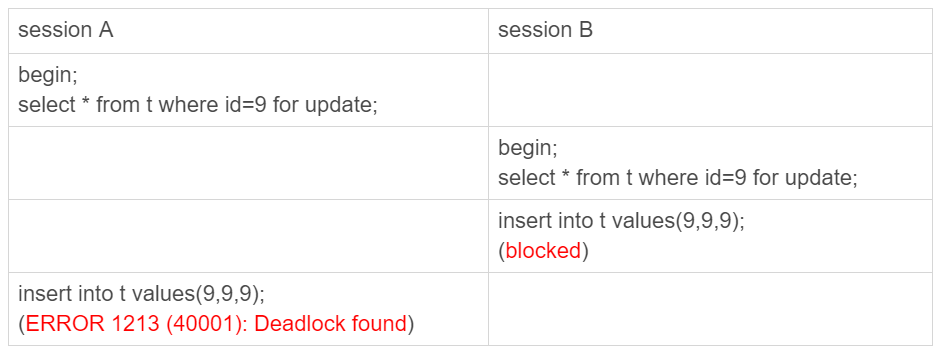 至此,两个session进入互相等待状态,形成死锁。当然,InnoDB的死锁检测马上就发现了这对死锁关系,让session A的insert语句报错返回了。