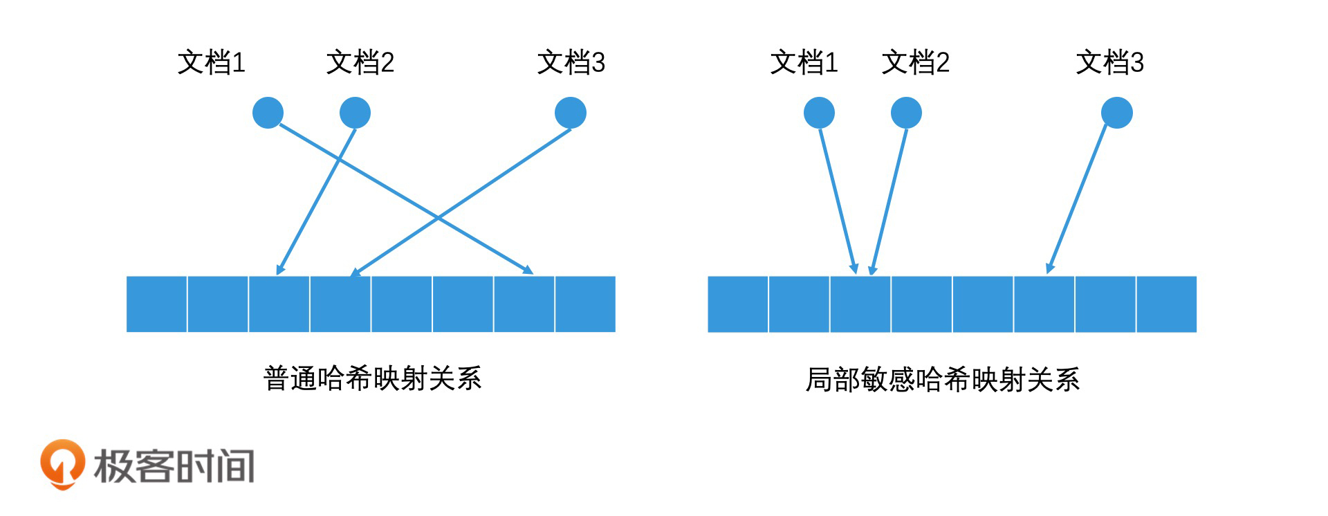 不过,如果我们用的是普通的哈希函数,只要文档中的关键词有一些轻微的变化(如改变了一个字),哈希值就会有很大的差异。但我们又希望,整体相似度高的两篇文档,通过哈希计算以后得到的值也是相近的。因此,工业界设计了一种哈希函数,它可以让相似的数据通过哈希计算后,生成的哈希值是相近的(甚至是相等的)。这种哈希函数就叫作局部敏感哈希(Locality-Sensitive Hashing)。