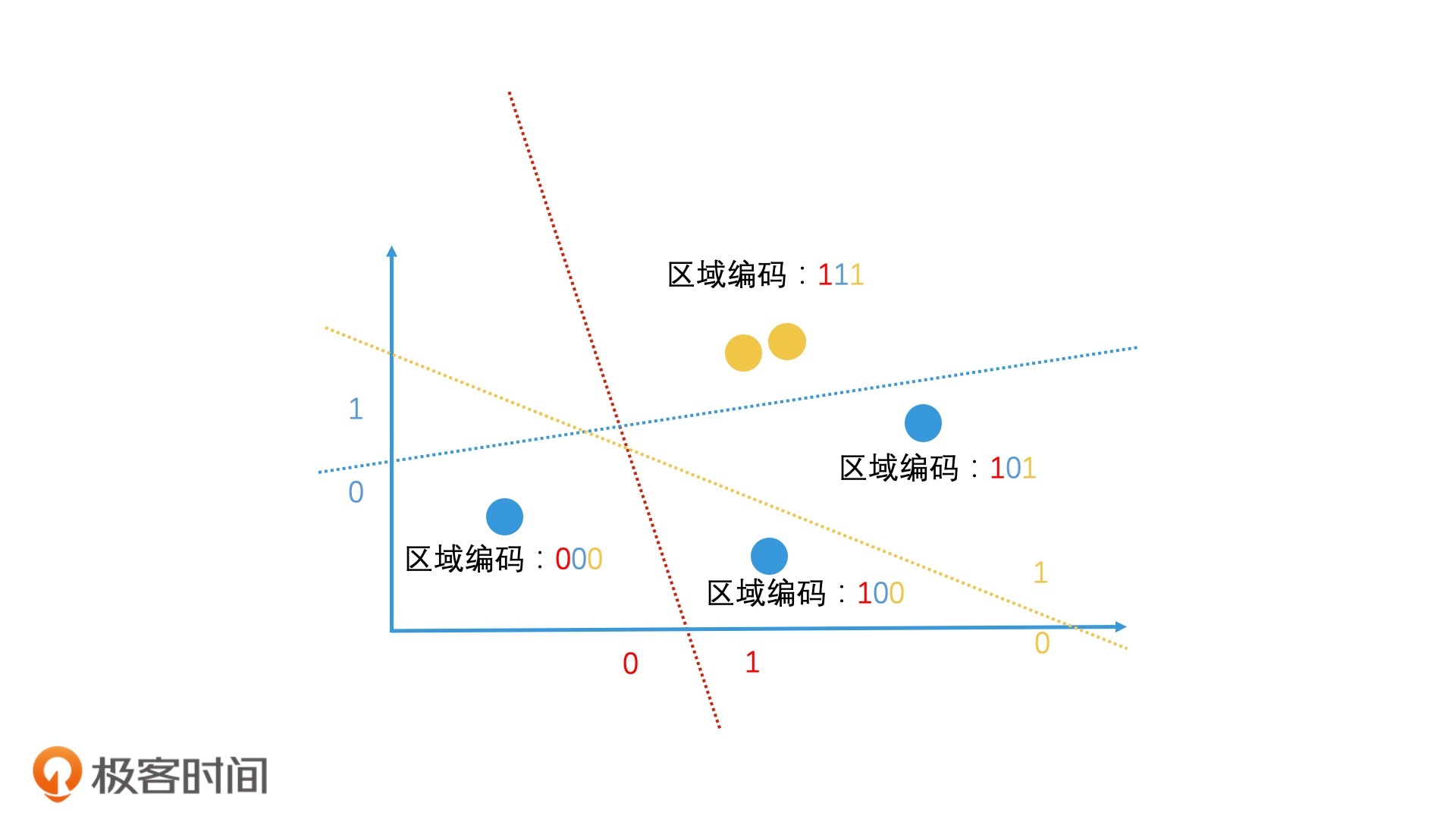 当然,这样的划分有很大的随机性,不一定可靠。但是,如果我们连续做了n次这样的随机划分,这两个点每次都在同一边,那我们就可以认为它们在很大概率上是相近的。因此,我们只要在n次随机划分的过程中,记录下每一个点在每次划分后的值是0还是1,就能得到一个n位的包含0和1的序列了。这个序列就是我们得到的哈希值,也就是区域编码。
