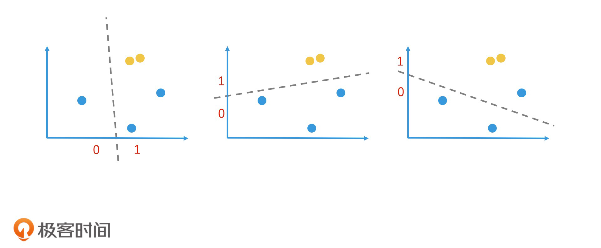 在二维空间中,我们随意划一条直线就能将它一分为二,我们把直线上方的点的哈希值定为1,把直线下方的点的哈希值定为0。这样就完成一个简单的哈希映射。通过这样的随机划分,两个很接近的点被同时划入同一边的概率,就会远大于其他节点。也就是说,这两个节点的哈希值相同的概率会远大于其他节点。