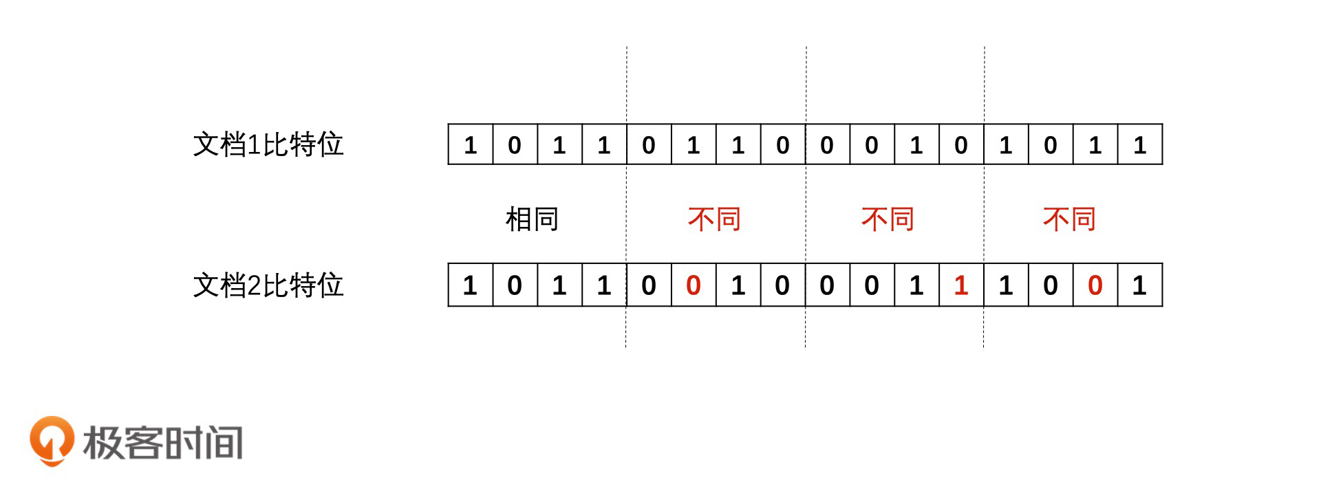 上面我们说的判断标准都比较笼统,实际上,在利用局部敏感哈希值来判断文章相似性的时候,我们会以表示比特位差异数的海明距离(Hamming Distance)为标准。我们可以认为如果两个对象的哈希值的海明距离低于k,它们就是相近的。举个例子,如果有两个哈希值,比特位分别为00000和10000。你可以看到,它们只有第一个比特位不一样,那它们的海明距离就是1。如果我们认为海明距离在2之内的哈希值都是相似的,那它们就是相似的。