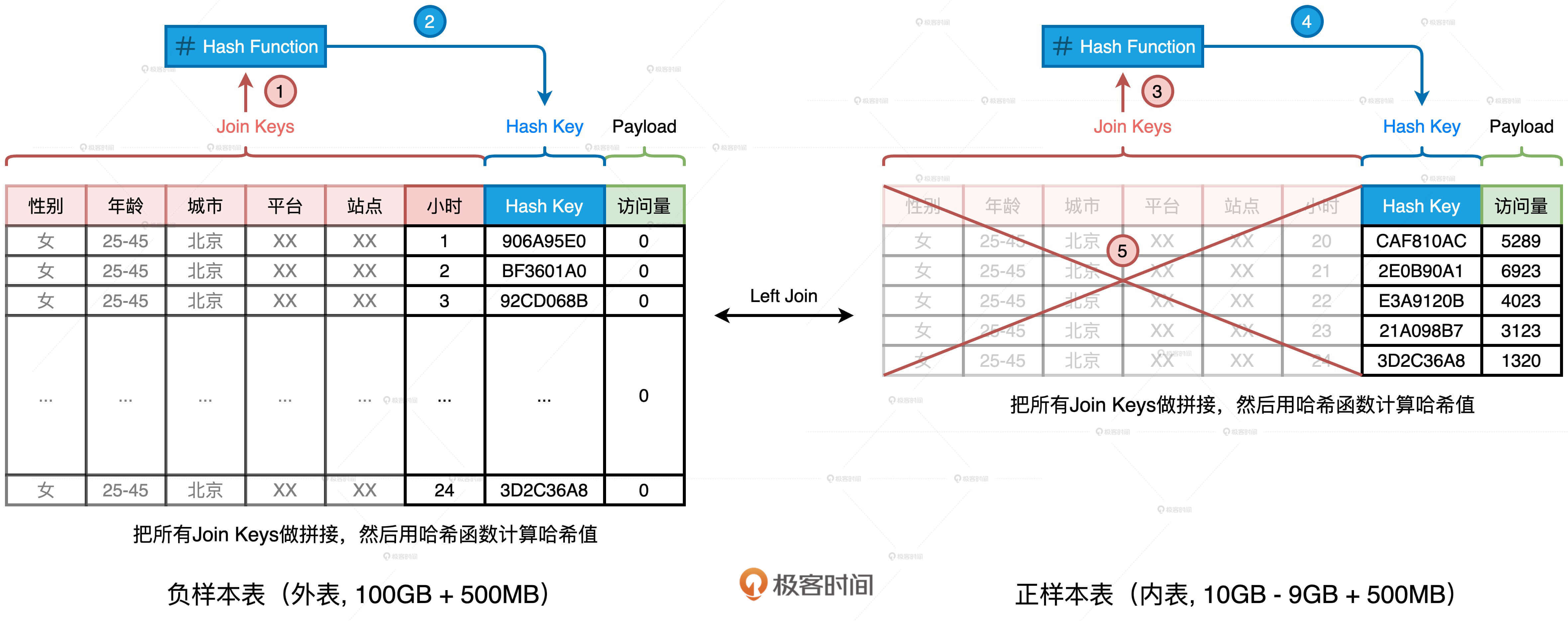 - 把所有Join Keys拼接在一起,把性别、年龄、一直到小时拼接成一个字符串,如图中步骤1、3所示