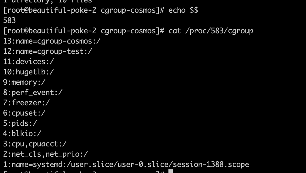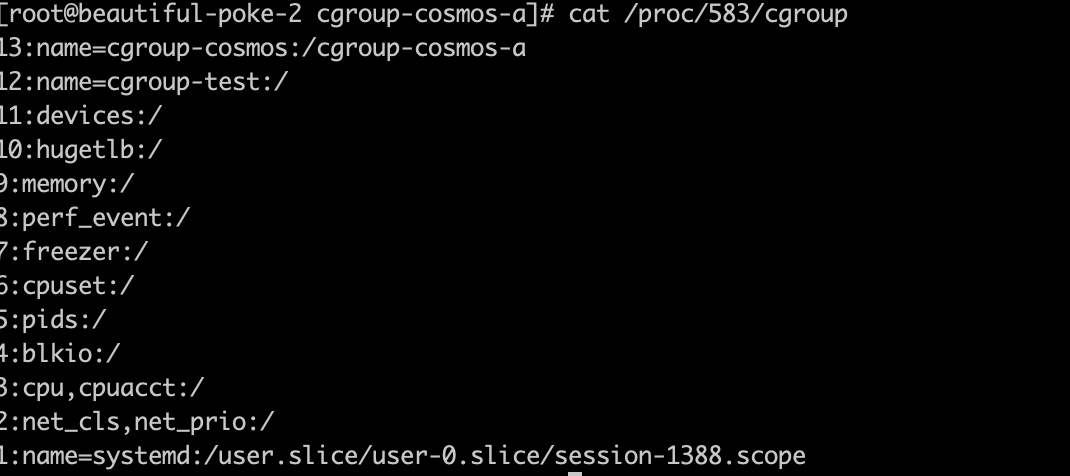 结合图里的代码我们发现,当前的583进程是在cgroup-cosmos下,现在我们将终端进程移动到cgroup-cosmos-a。