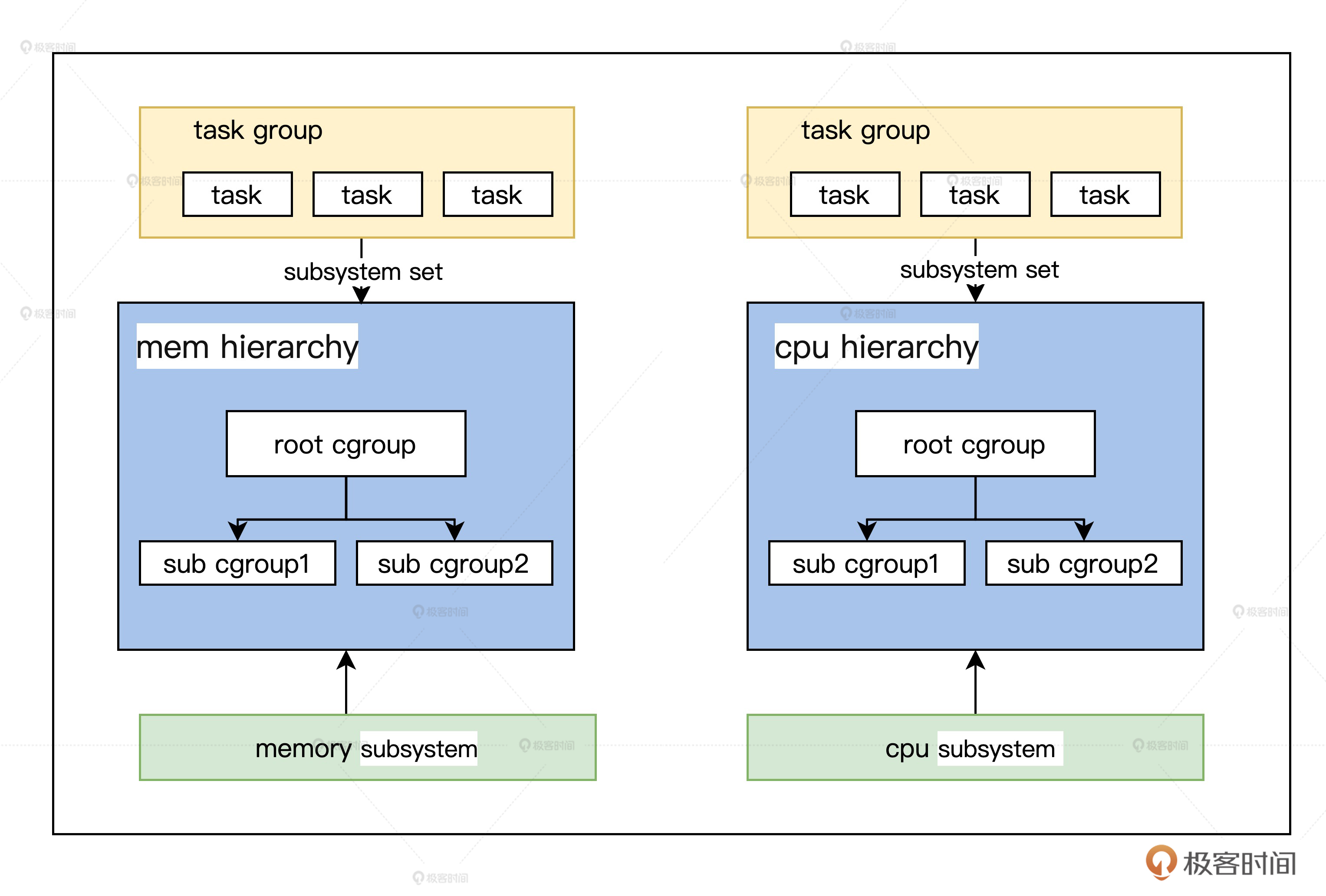 Cgrpups包含几个核心概念,分别是Task (任务)、Control Groups(控制组)、subsystem(子系统)、hierarchy(层级数)。