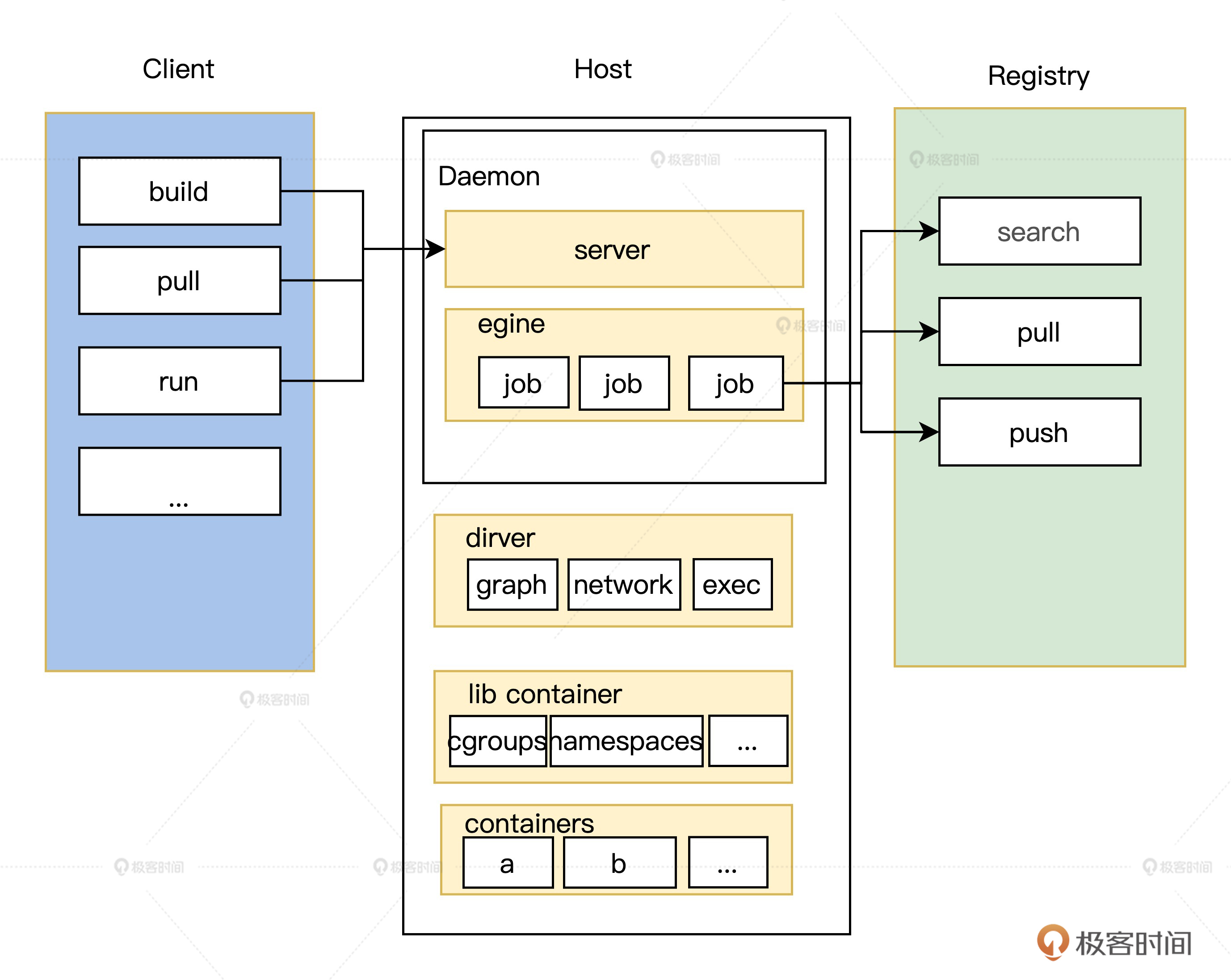 接下来,我们详细说说守护进程、镜像、驱动和容器管理这几个模块的运作机制/实现原理。