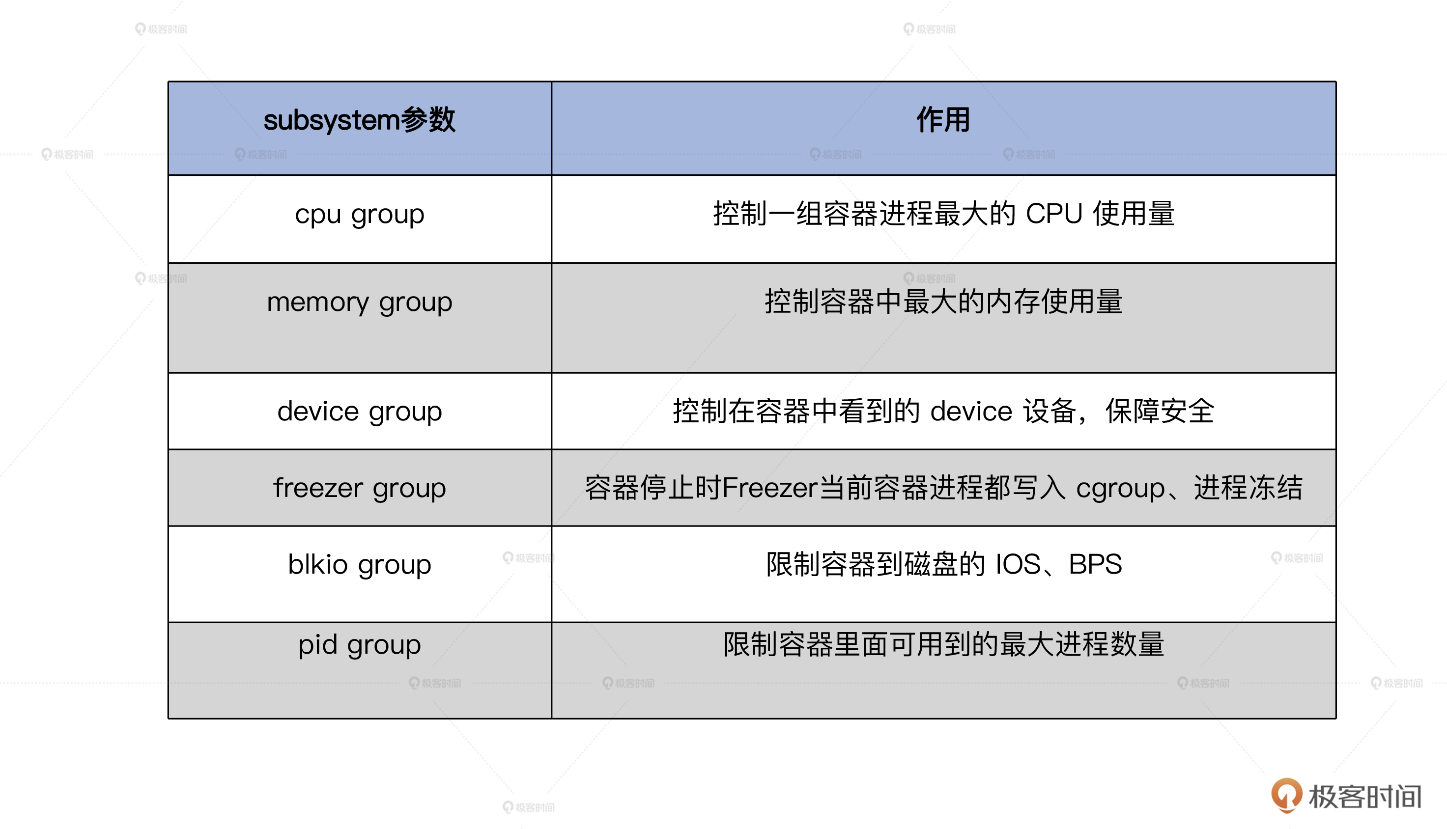 Linux内核提供了很多Cgroup subsystem参数,我们了解一下容器中常用的几类。: