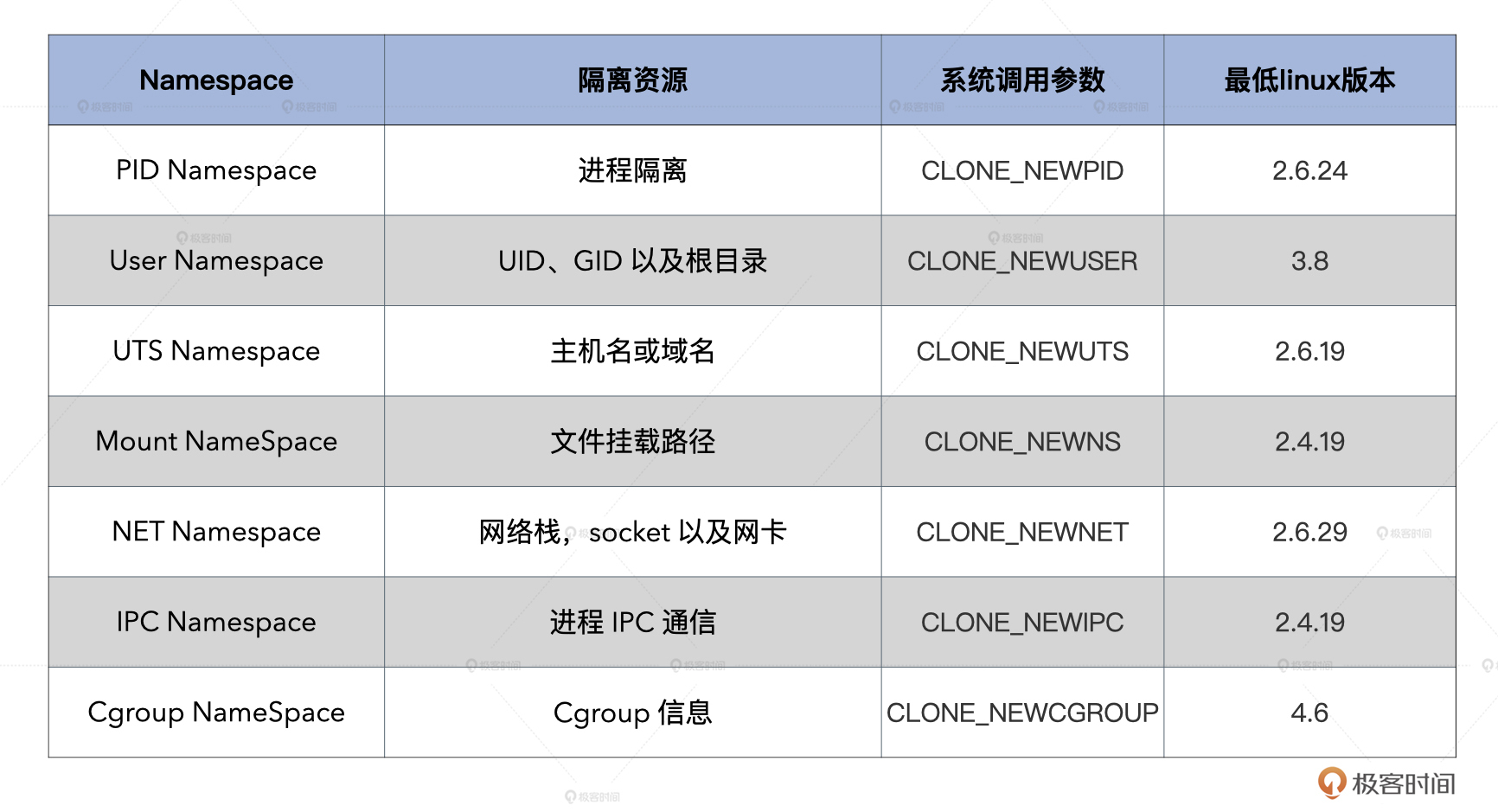 好了,刚刚我给你简单讲了NameSpace的作用以及不同类型的NameSpace。这几种Namespace都是只为做一件事,**隔离容器的运行环境,**此外,NameSpace是和进程息息相关的,NameSpace将全局共享的资源划分为多组进程间共享的资源,当一个NameSpace下的进程全部退出,NameSpace也会被销毁。