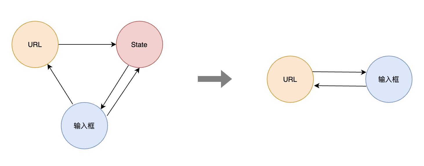 要解决这个问题,一个比较容易想到的思路就是我们要有更加完善的机制,让在 URL 不管因为什么原因而发生变化的时候,都能同步查询参数到 searchKey 这个 State。但是如果沿着这个思路,那么状态管理就会一下子变得非常复杂。因为我们需要维护三个状态的一致性。