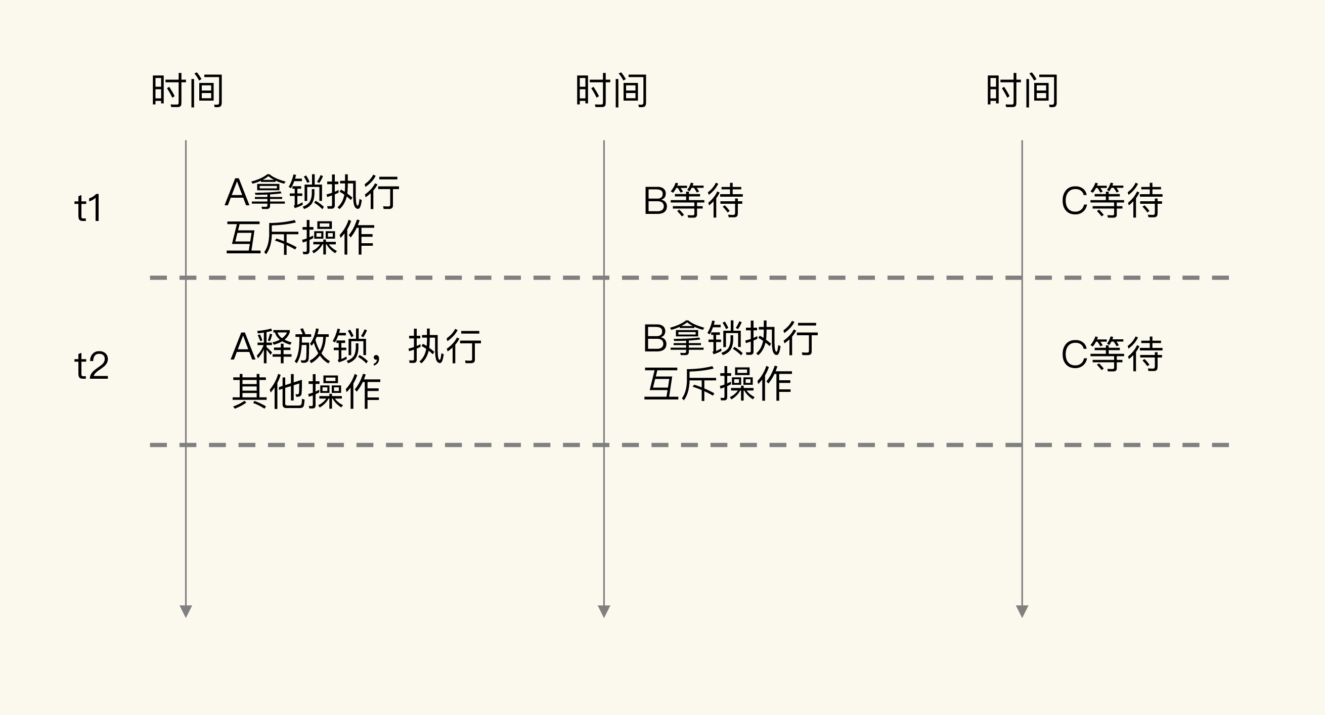 如下图所示,当客户端A加锁执行操作时,客户端B、C就需要等待。A释放锁后,假设B拿到锁,那么C还需要继续等待,所以,t1时段内只有A能访问共享数据,t2时段内只有B能访问共享数据,系统的并发性能当然就下降了。