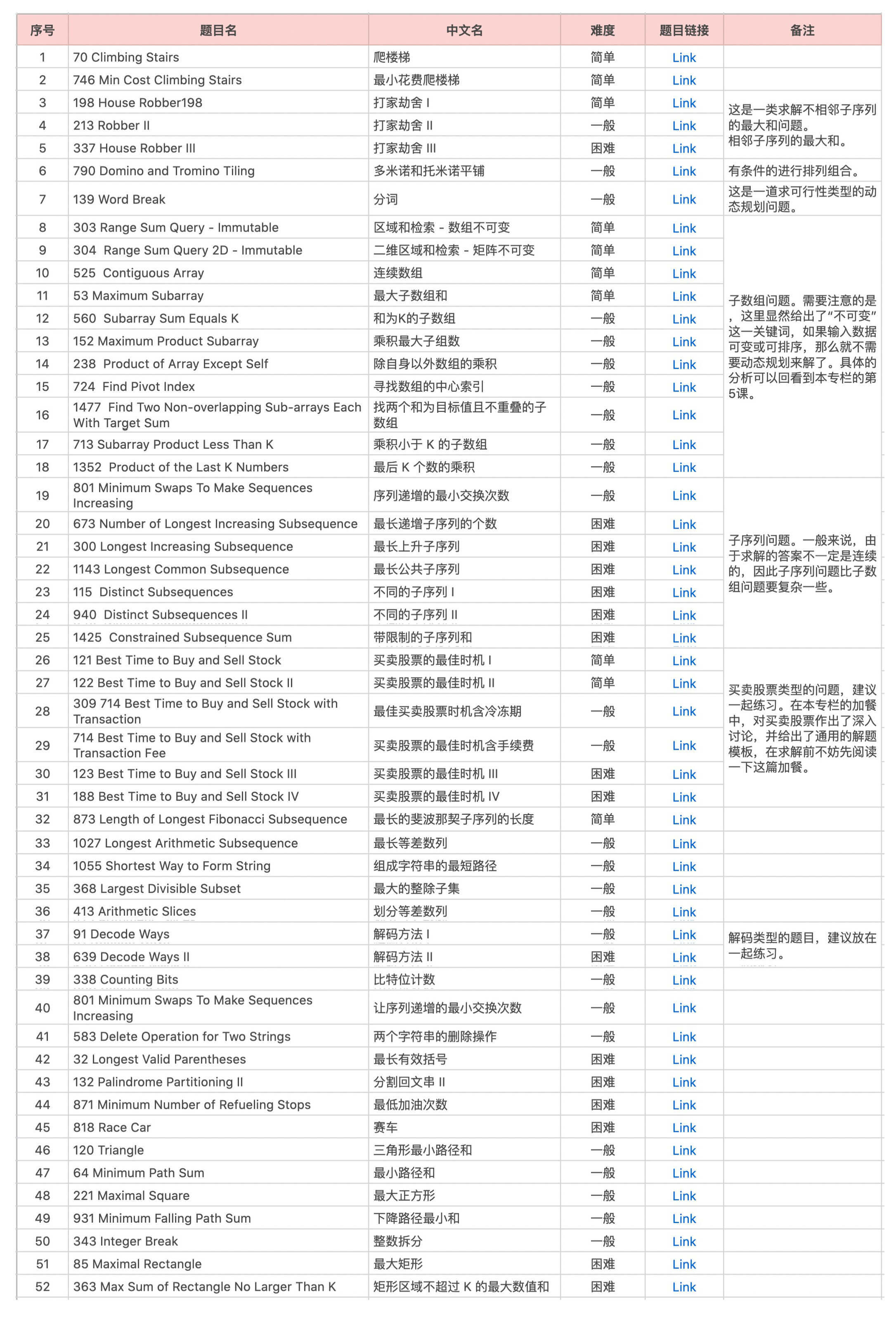 动态规划题目总结表格见链接(请关注题目链接的同学点击此处进行查看):https://shimo.im/sheets/hrHvGxvRD3xxvvGD/SZhqW