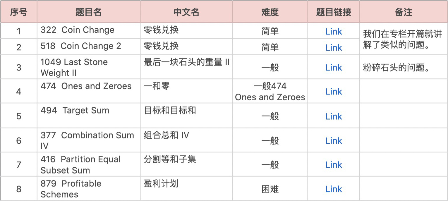 只不过,在技术面试环节,即便考察了背包问题,往往考察的也是其变种。我们曾在[第6课]就提出过一个粉碎石头的问题,那就是一个背包问题的变种。