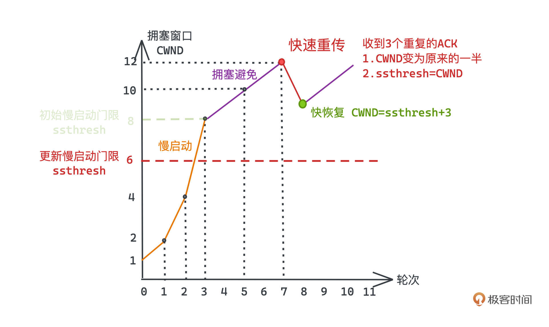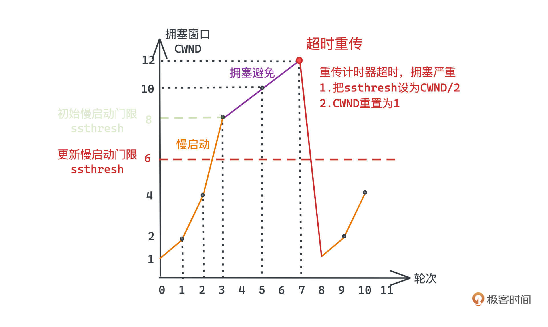 - 超时重传,往往意味着拥塞情况更严重,我们的策略也会更激进一些,会直接将ssthresh设置为重传发生时窗口大小的一半,而窗口大小直接重置为0,再进入慢启动阶段。像这样: