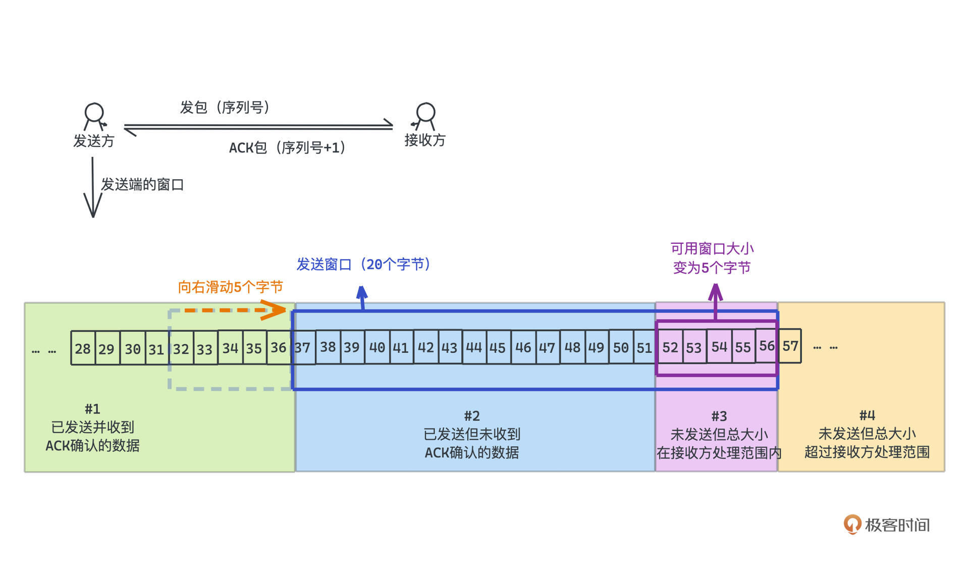 - 第三部分是还没有发送,但是还在接收方通告窗口也就是处理范围内的数据,这块我们也可以称为可用窗口;第二、第三部分一起构成了我们的整个发送窗口。