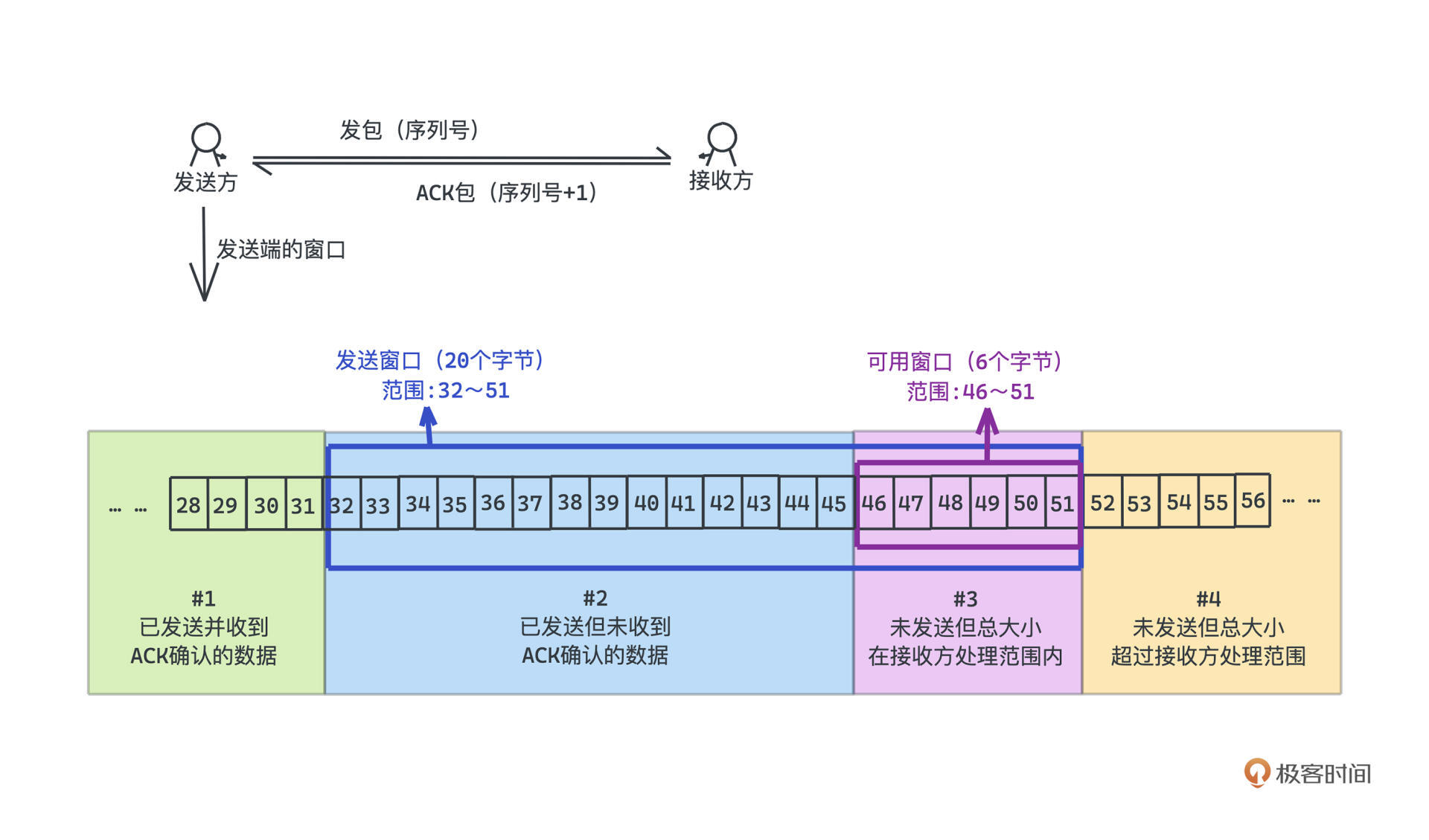 发送窗口根据三个标准来划分:是否发送、是否收到ACK、是否在接收方通告处理范围内,分成了四个部分。