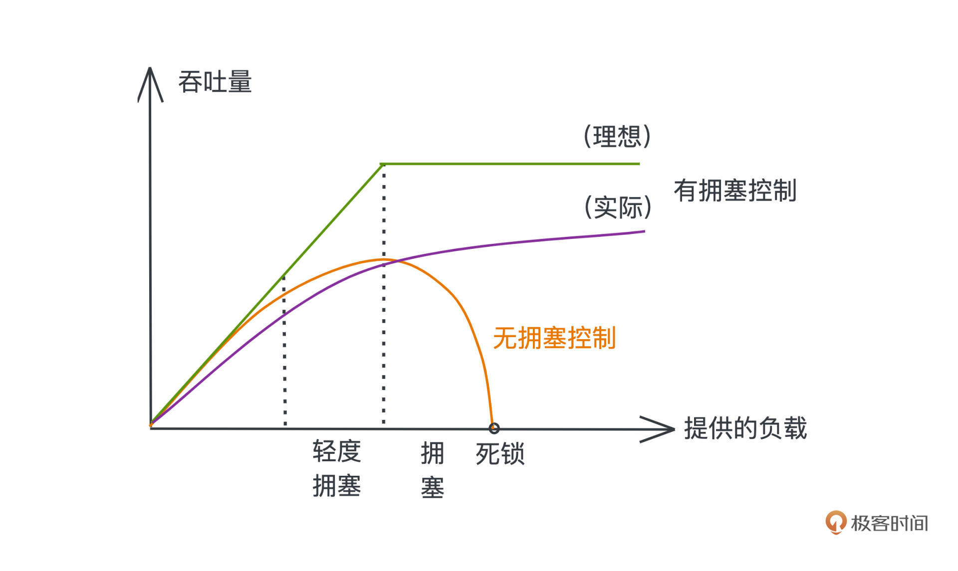 在实际网络中,因为大量的包传输,可能导致中间某些节点的缓冲区满载,从而多余的包被丢弃,需要重新发送,情况越发恶化,最差的时候,网络上的包都是重传的包并且反复地丢弃;整个网络传输能力甚至可以降低为0。
