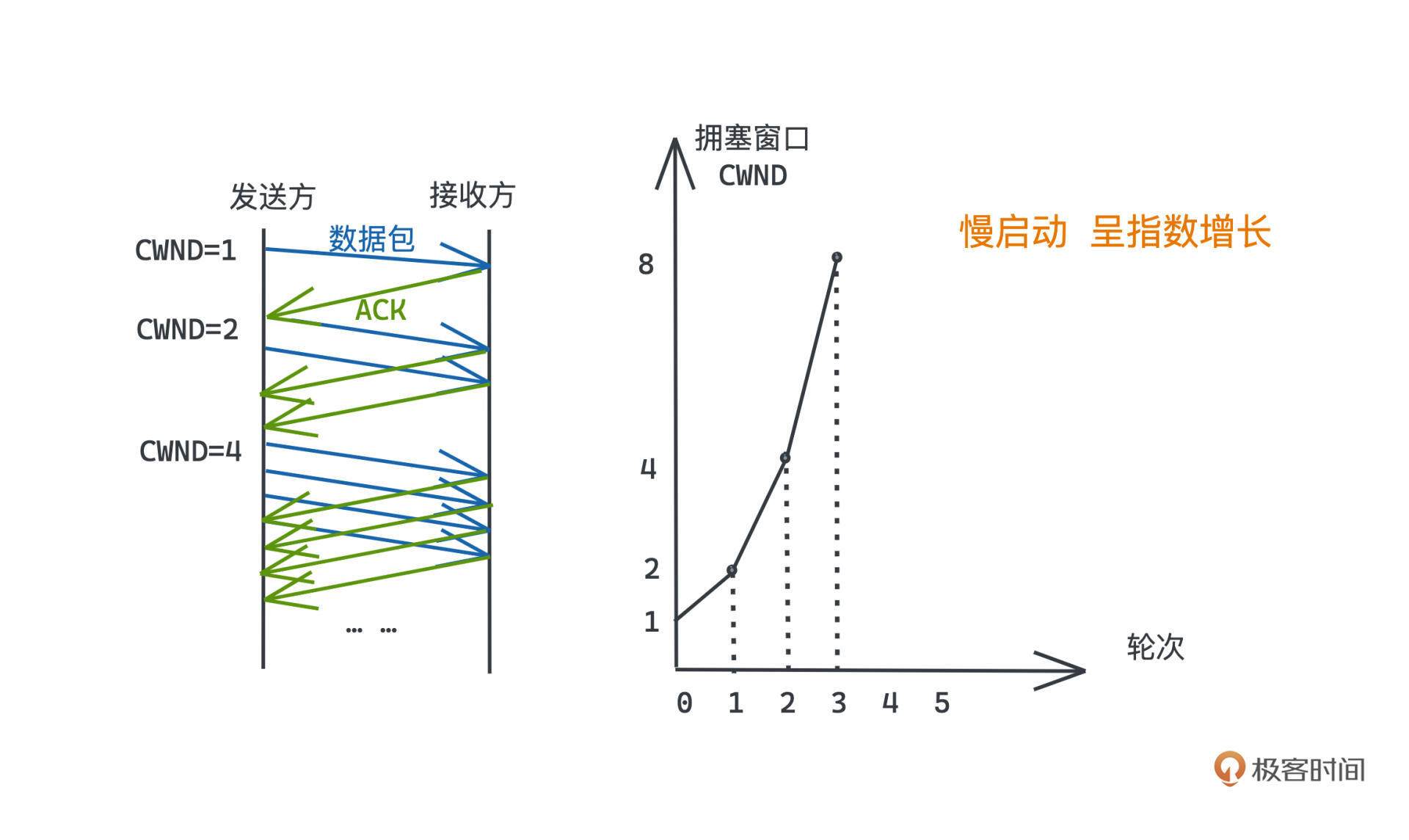 这样,倍增的方式窗口就会很快扩大;我们会在窗口大到一定程度时,减慢增加的速度,转成线性扩大窗口的方式,也就是每次收到新的ACK没有丢包的话只比上次窗口增大1。整个过程看起来就像这样:
