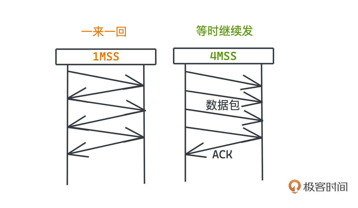 最后也给你留一个思考题。前面提到了一个叫快速重传的机制,也就是连续3次收到相同的ACK,发送端就会意识到丢包的产生,我们没有详细讨论,你能说说看为什么这样比直接超时重传的方式更好吗?它有没有什么其他问题呢,会不会有更好的方式解决呢?