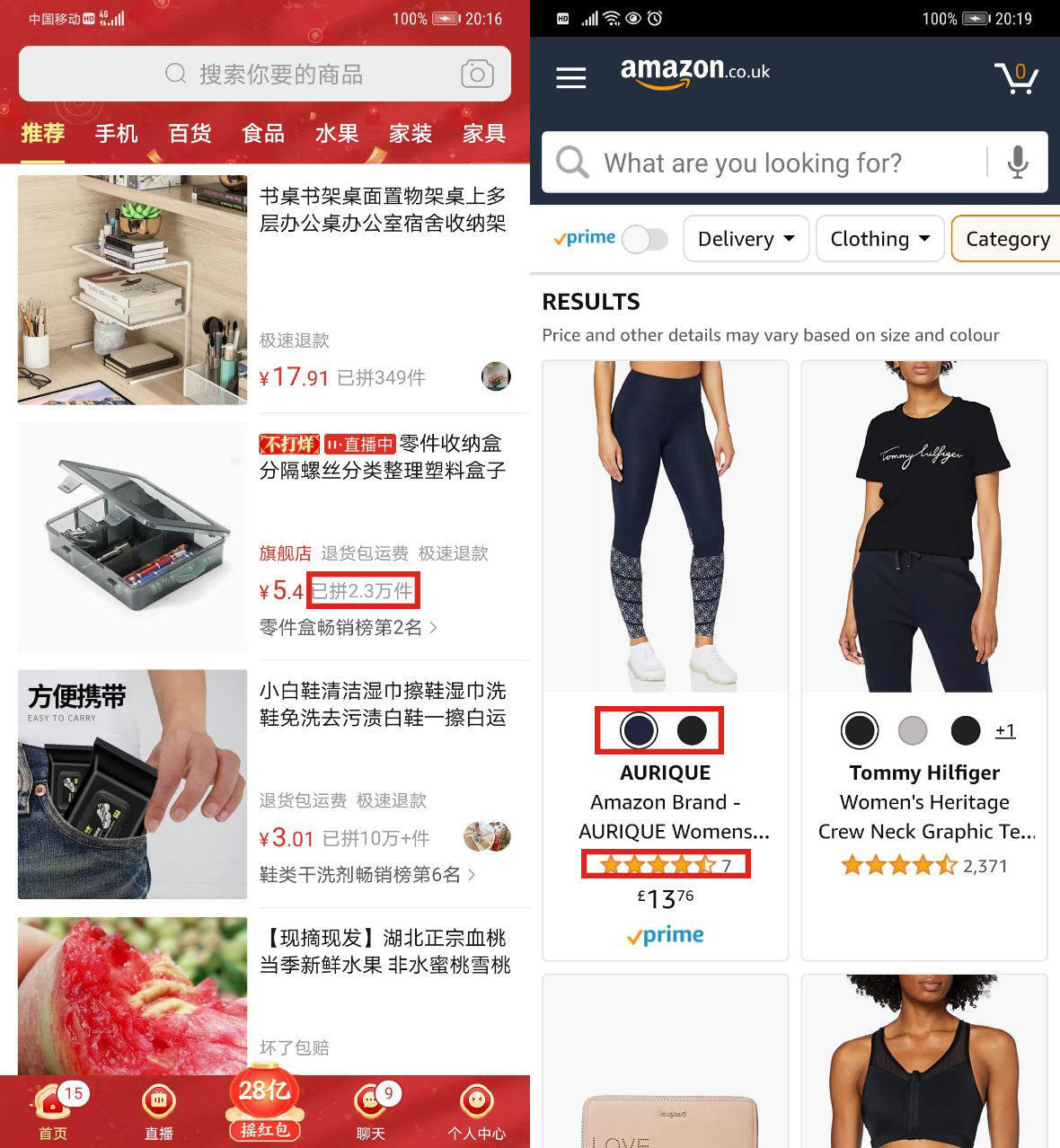 很多文化都可以通过上述七个维度来诠释和理解,这里面没有好坏之分。我在这里给你举一个简单的例子。比如拿购物这件事来说,下图左半部分是集体主义文化背景的购物平台,它就会选择凸显某个商品已经被多少人购买。右半部分为个人主义文化的购物平台,把商品的色彩选择放在商品缩略里面,反而把多少人给予评级放在了次级位置。