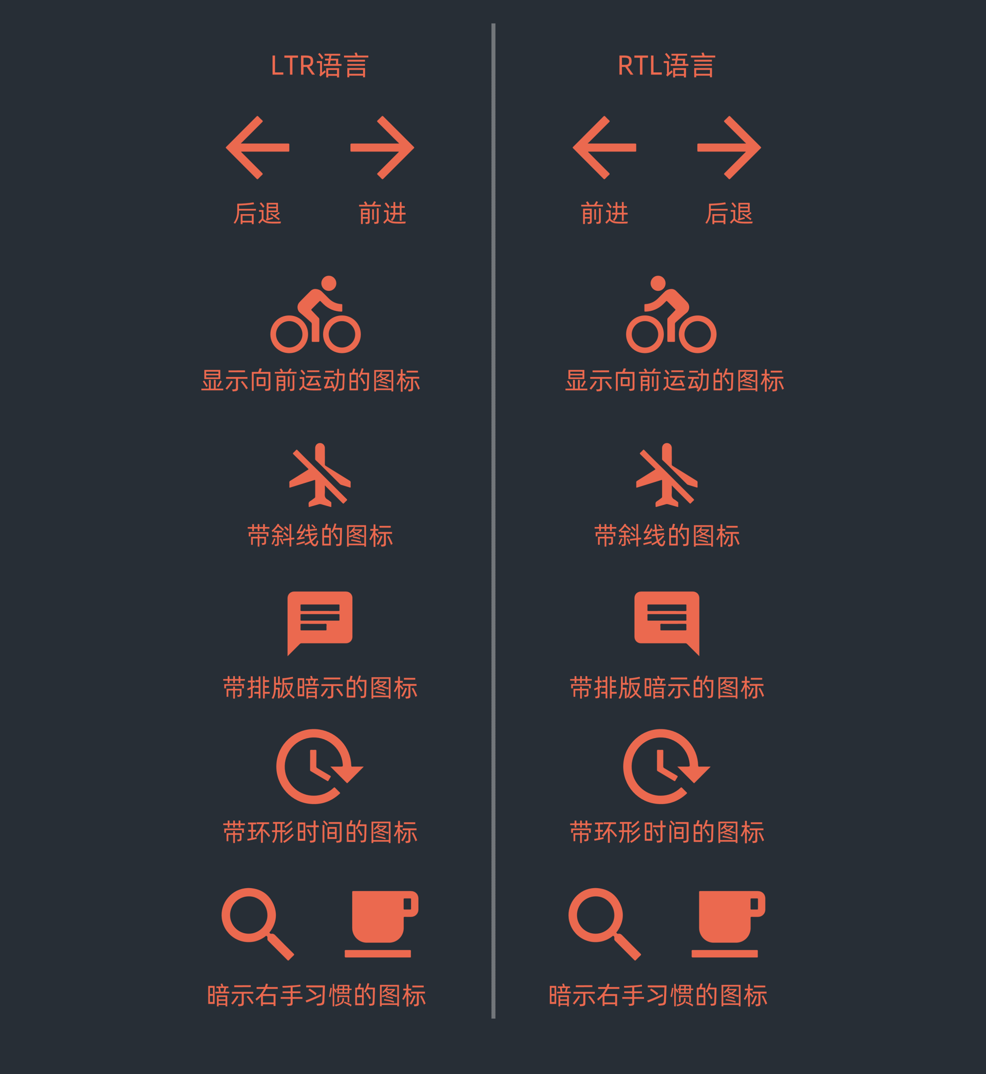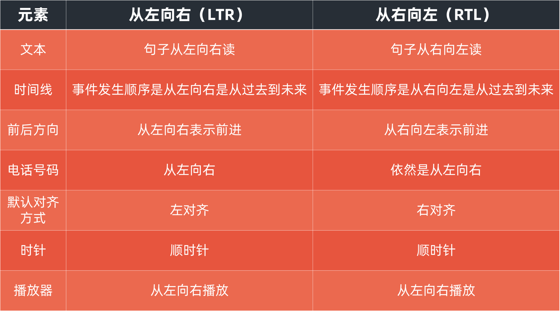 在文本阅读顺序、时间线、前后方向的意象以及对齐方式都是相反的。但是在电话号码、顺时针和媒体播放上,大家的理解都是一致的,这几项不必刻意做镜像处理。