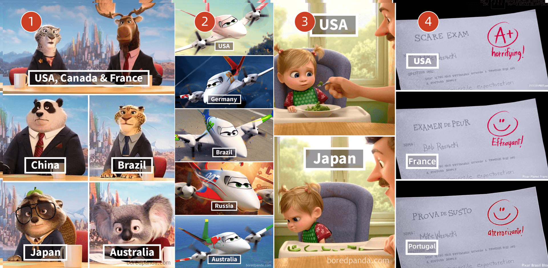 看来在全球化和本地化推广过程中,处处都是雷。那么在体验设计上,我们应该注意哪些呢?我们先从皮克斯和迪士尼动画的全球化和本地化案例说起。你可以先看看下面的动画电影适配示例。