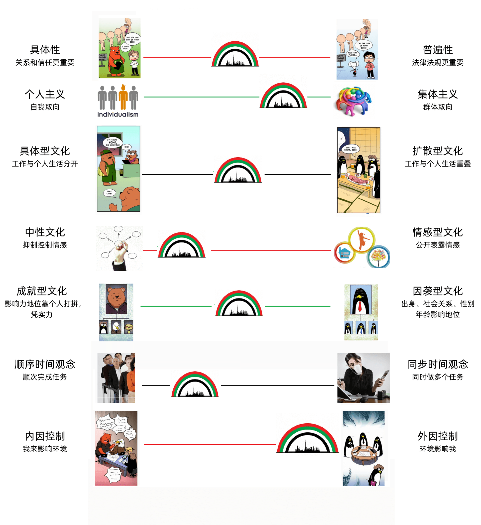 有很多维度可以去理解文化差异性,那我们具体从哪里入手呢?组织学专家川普涅尔(Trompenaars)把文化差异性分为七个维度,参见下图分别为:
