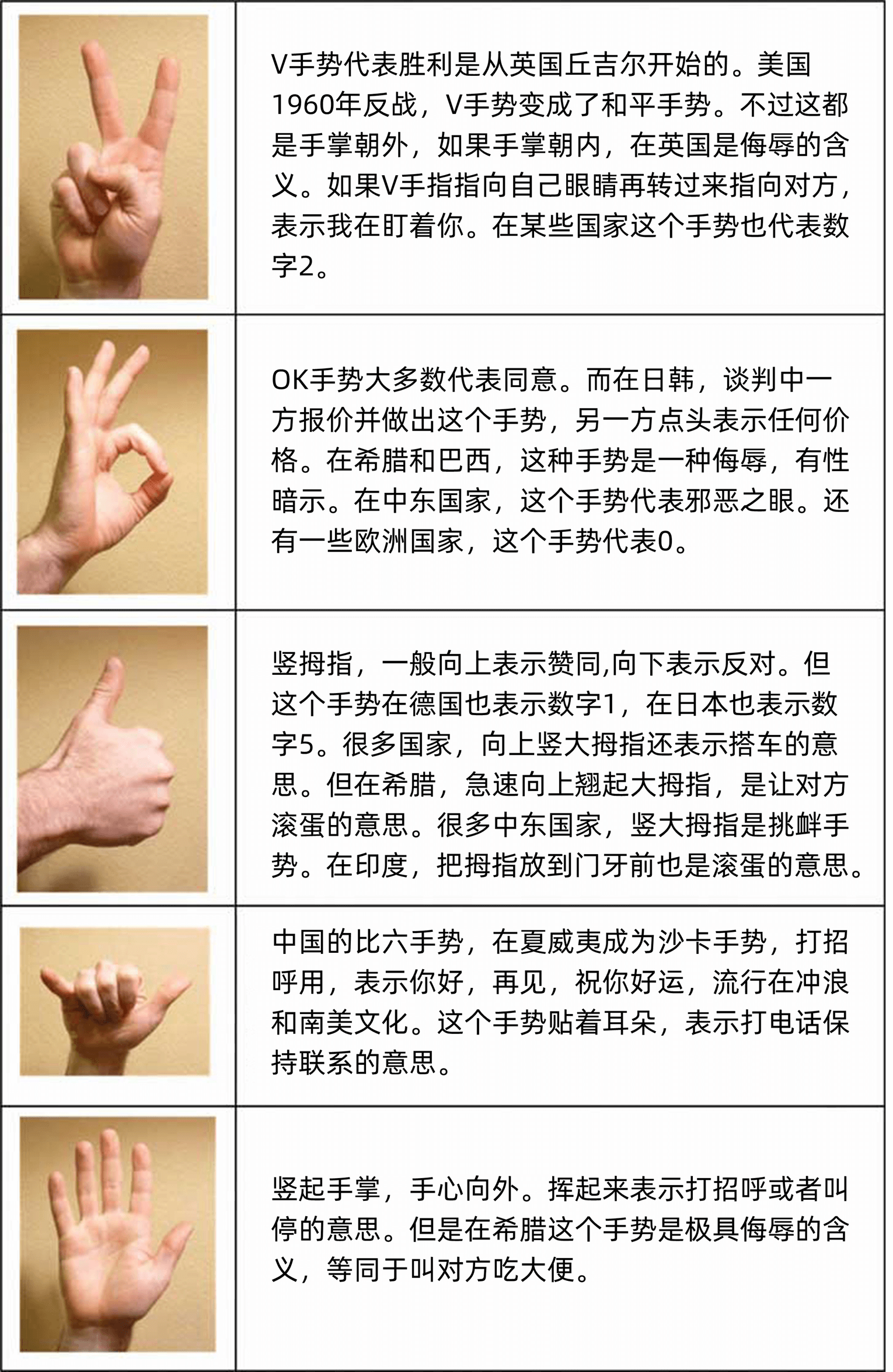 对同一种肢体语言来说,可能这个肢体语言在一种文化中是正向表达,但是在另外一种文化里却是负向表达。我下面列了一个表,表里列出了一些一般人认为安全的正向表达的手势,但这些手势可能在某些文化里忌讳被使用。