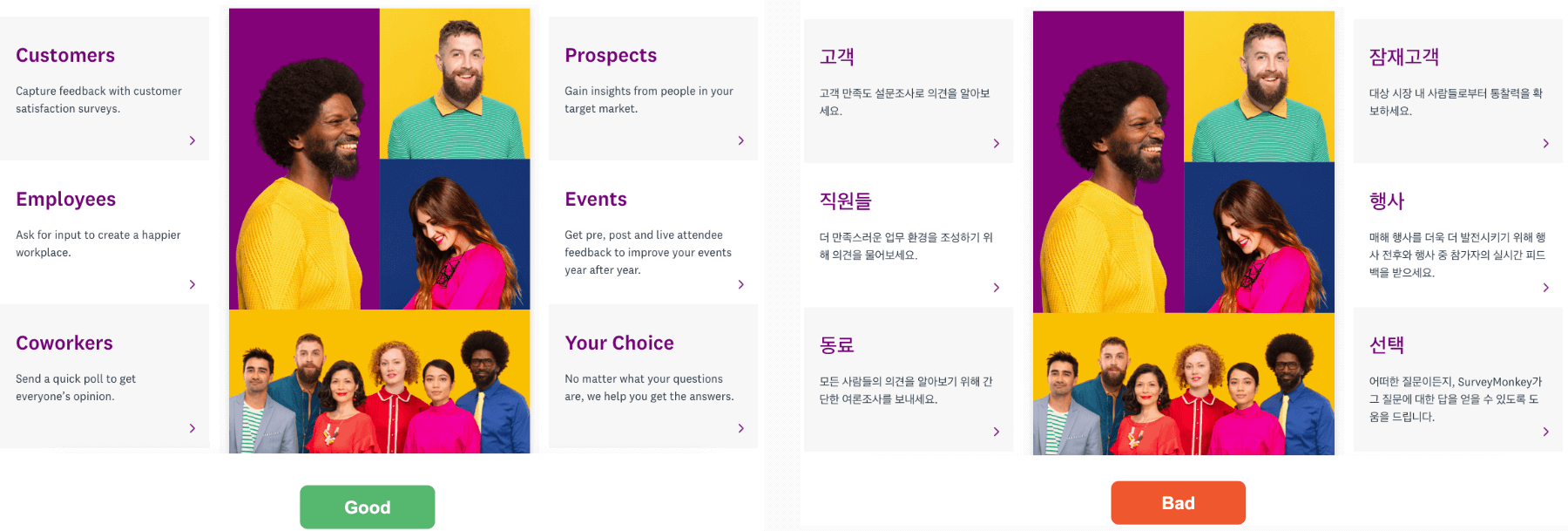 在一个多元化国家,不要都是白人图片,需要把其他人种也照顾到。下图中左半部分是正确例子,右边是错误的示例(右边进行了韩国的本地化,却没有见到韩国人面孔)。
