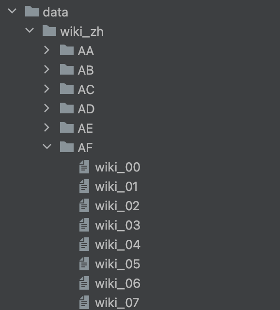 1 2 3 4 5 6 7 8 9 10 11 12 13 14 15 16 17 18 19 20 21 22 23 24 25 26 27 28 29 30 31 import jsonimport osclass PrepareData (): @staticmethod def prepare (): root_dir = 'data/wiki_zh' ds = [] for dir_path, dir_names, file_names in os.walk(root_dir): for file_name in file_names: file_path = os.path.join(dir_path, file_name) if "." in file_path: continue with open (file_path, 'r' ) as file: for line in file: try : text = json.loads(line)["text" ] print (text) ds.append(text) except json.JSONDecodeError: print ("格式不正确" ) print (len (ds)) with open ('data/sentence.txt' , 'w' ) as file: for i in ds: file.write(i + '\n' ) return ds data_set = PrepareData.prepare() for item in data_set: print (item)
