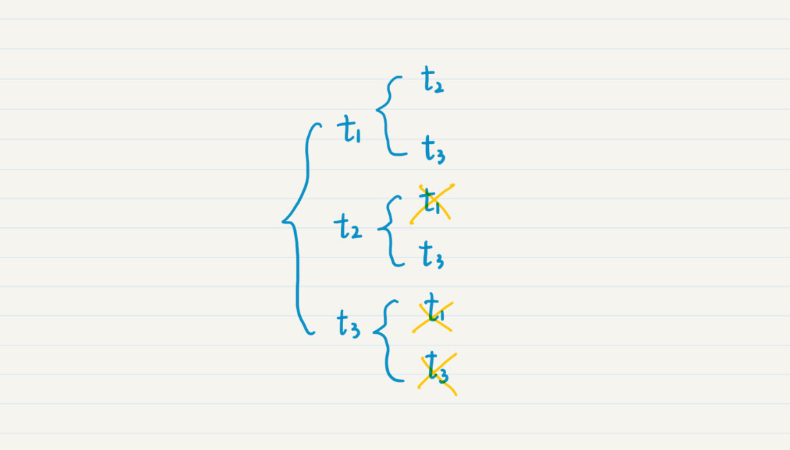 我们假设有3个队伍,t1,t2和t3。我还是把递归的选择画成图,这样比较直观,你也好理解。从图中我们可以看出,对于组合而言,由于{t1, t2}已经出现了,因此就无需{t2, t1}。同理,出现{t1, t3},就无需{t3, t1}等等。对于重复的,我用叉划掉了。这样,最终只有3种组合了。