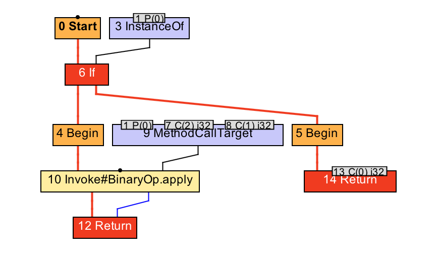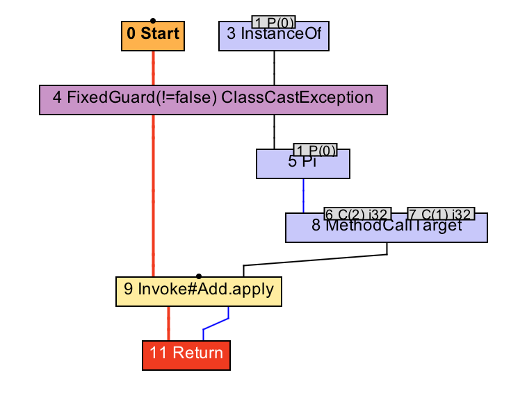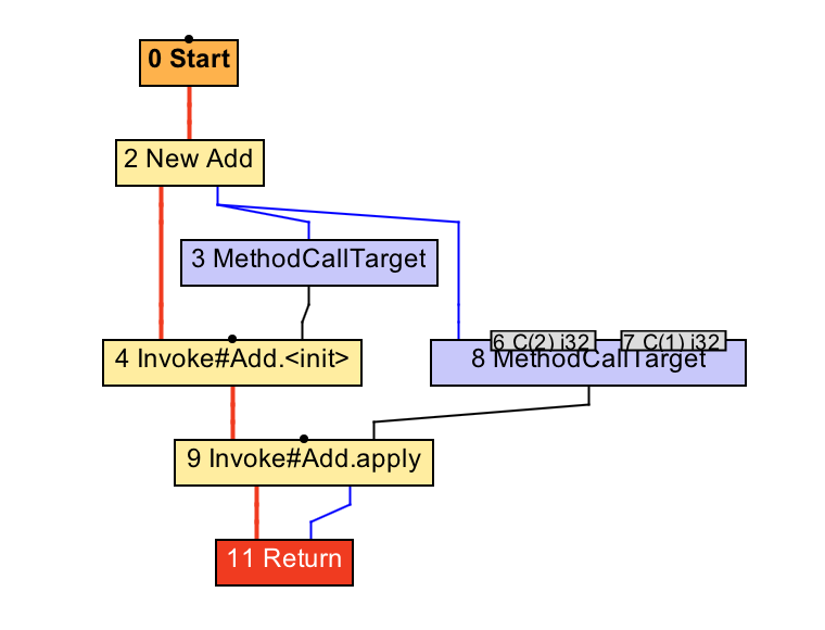 在上面两张IR图中,方法调用的调用者(即8号CallTarget节点的第一个依赖值)分别为2号New节点,以及5号Pi节点。后者可以简单看成强制转换后的精确类型。由于这两个节点的类型均被精确为Add类,因此,原invokevirtual指令对应的9号invoke节点都被识别对Add.apply方法的调用。